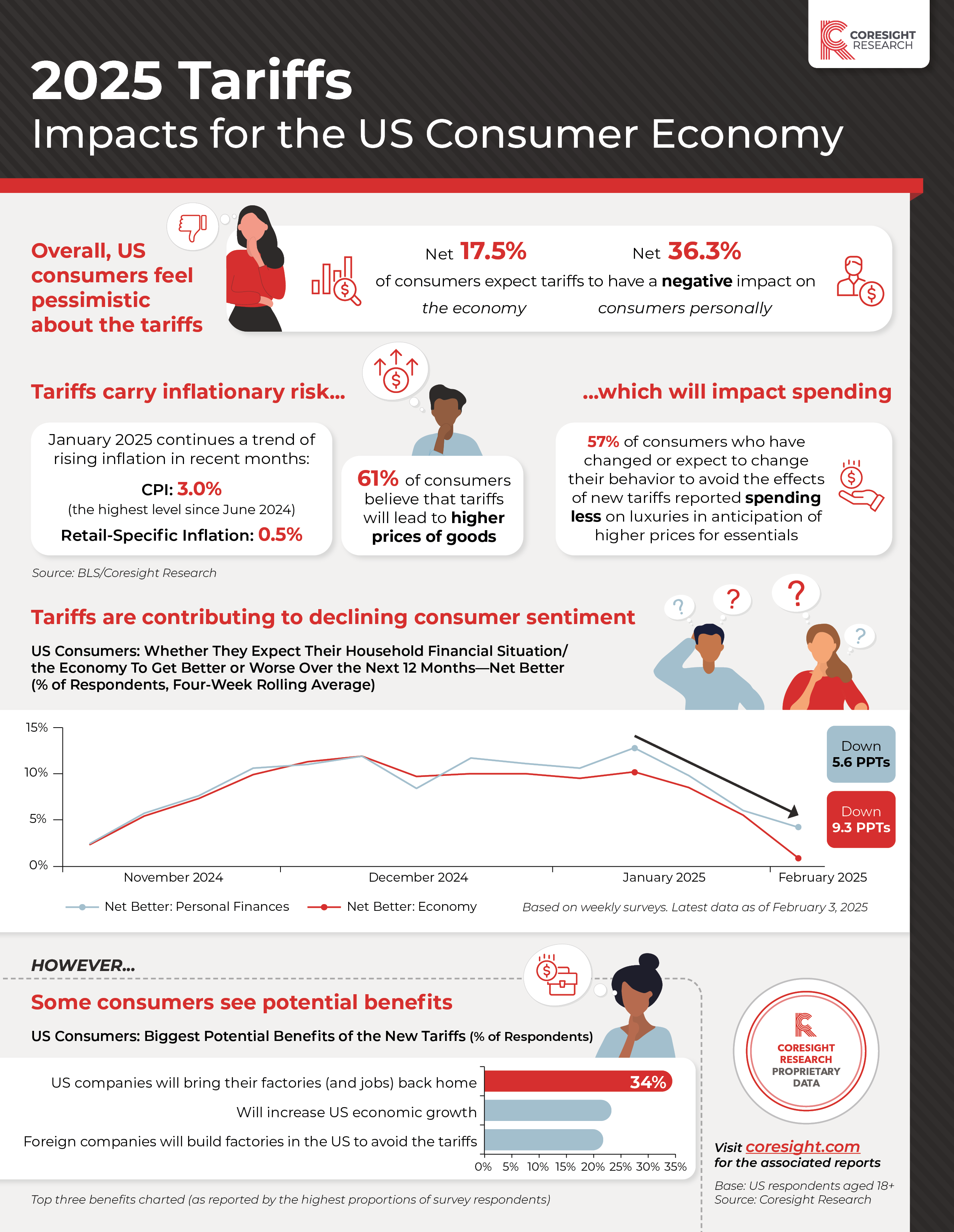 Infographic2025 Tariffs: Impacts on the US Consumer Economy—Infographic Coresight Research Sector Lead: John Mercer, Head of Global Research and Managing Director of Data-Driven Research February 17, 2025 Reasons to ReadDiscover new data on the US consumer economy in this free infographic, spanning inflation, consumer sentiment and tariffs. Proprietary survey data in this research report include: How US consumers believe the tariffs will impact the overall economy and their personal finances The potential drawbacks and benefits of the new tariffs How consumers will change their shopping behaviors to avoid the effects of tariffs Other relevant research: Inflation Up, Sentiment Down: Alarm Bells for the US Consumer Economy? Dive into our full survey findings: 2025 Tariffs: What Do US Consumers Think?—Proprietary Survey Insights New Tariffs, New Challenges: How US Trade Policies Could Impact Prices and Profits Retail 2025: US Macro, Consumer and Retail Outlook All our coverage of the consumer and macroeconomics The Coresight Research US Consumer Survey Databank provides additional insight into US consumer behaviors from our weekly surveys. The US Retail Sales Databank features retail sales values and year-over-year growth, in total and by sector, by year and by month. This Databank is updated monthly. This document was generated for Other research you may be interested in: Weekly US and UK Store Openings and Closures Tracker 2025, Week 9: Joann To Close an Additional 300+ Stores, Shuttering All LocationsHoliday 2024: US Retail Wrap-Up—Apparel and Amazon Dominate SpendingAnalyst Corner: Beauty’s Back! The US Beauty Market Bounces Back, with Madhav Pitaliya and John MercerIndia’s Maha Kumbh Mela 2025: How Convenience, Technology and Sustainability Powered a Multibillion-Dollar Festival