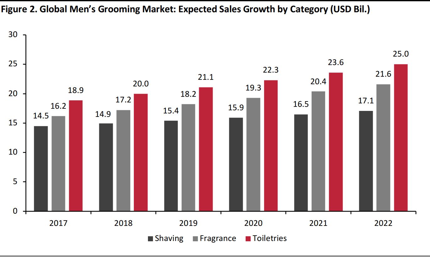 Sales growth of men’s toiletries—which Euromonitor defines as men’s bath and shower, deodorant, skincare, and haircare products—is outpacing sales growth of men’s shaving products. Men’s toiletries are expected to grow at a CAGR of 5.8% from 2017 to 2022, from $18.9 billion to $25.0 billion, while shaving products are expected to grow at a CAGR of 3.4% from $14.5 billion to $17.1 billion, over the same period. Men’s fragrances are expected to grow the fastest among the three categories, at a 6.0% CAGR from 2017 to 2022, from $16.2 billion to $21.6 billion, according to Euromonitor.