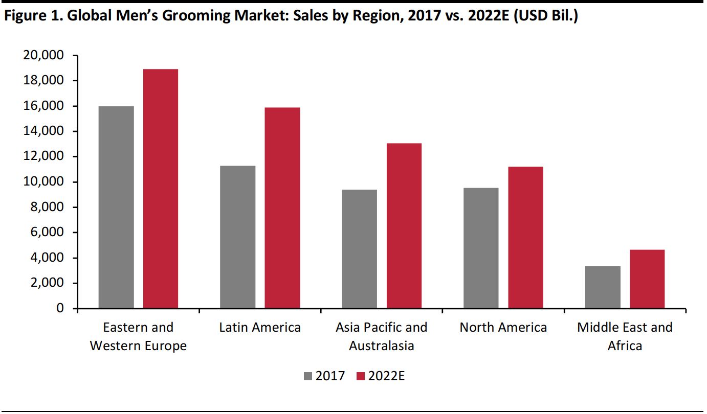 Global sales of men’s grooming products reached nearly $50 billion in 2017 and are on track to grow by 16% by 2020, according to Euromonitor International. Globally, the largest male grooming market in absolute terms is Western Europe, where category sales totaled $12.3 billion in 2017 and are projected to grow at a CAGR of 3.1% from 2017 to 2022, while the Eastern European category sales totaled $3.6 billion in 2017, and are projected to grow at a CAGR of 4.4% from 2017 to 2022. The market is smallest in the Middle East and Africa region, where men’s grooming product sales reached $3.4 billion in 2017 and are expected to grow to $4.7 billion in 2022. The market in Latin American is growing the fastest: men’s grooming product sales in the region totaled $11.3 billion in 2017 and are expected to grow at a 7.1% CAGR to 2022, to reach $15.9 billion. By way of comparison, the global men’s grooming market is expected to grow at a CAGR of 5.2% to 2022, according to Euromonitor.
