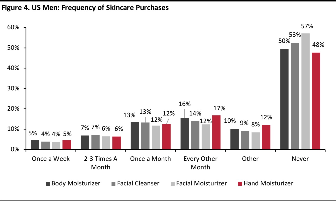 According to US survey data from Prosper Insights & Analytics, approximately 50% of American men regularly purchase body moisturizers, facial cleansers, facial moisturizers and hand moisturizers. Approximately 5% of men in the US purchase these products as frequently as once a week, and approximately 7% of them purchase such products two or three times per month. As men become more interested in skincare and health and wellness, brands and retailers can seize the opportunity to meet their needs by expanding product assortments beyond the basics to include, for example, products that offer anti-aging, sun protection or acne solutions.