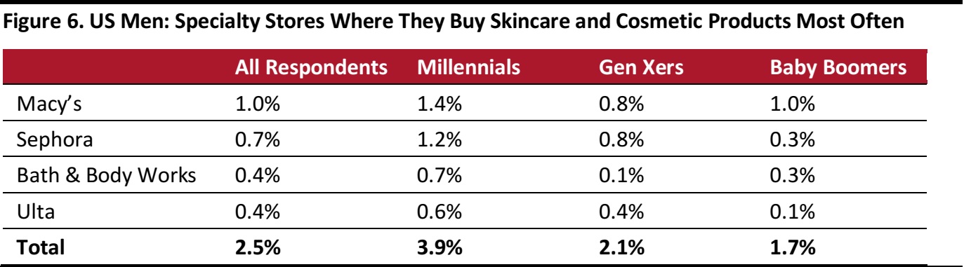 In the US, millennial men (ages 20–35) are more likely than their Gen X (ages 36–53) and baby boomer (ages 54–72) counterparts to shop for skincare and cosmetic products at specialty stores such as Macy’s, Sephora, Bath & Body Works and Ulta, according to Prosper’s survey data. Some 3.9% of millennial men surveyed said that they shop most often for skincare products at these four retailers, compared with 2.1% of Gen X men and 1.7% of baby boomer men. Stores such as Costco, Dollar Tree, Dollar General, Sam’s Club and Family Dollar ranked higher among the value-conscious Gen X and baby boomer demographics in Prosper’s survey.