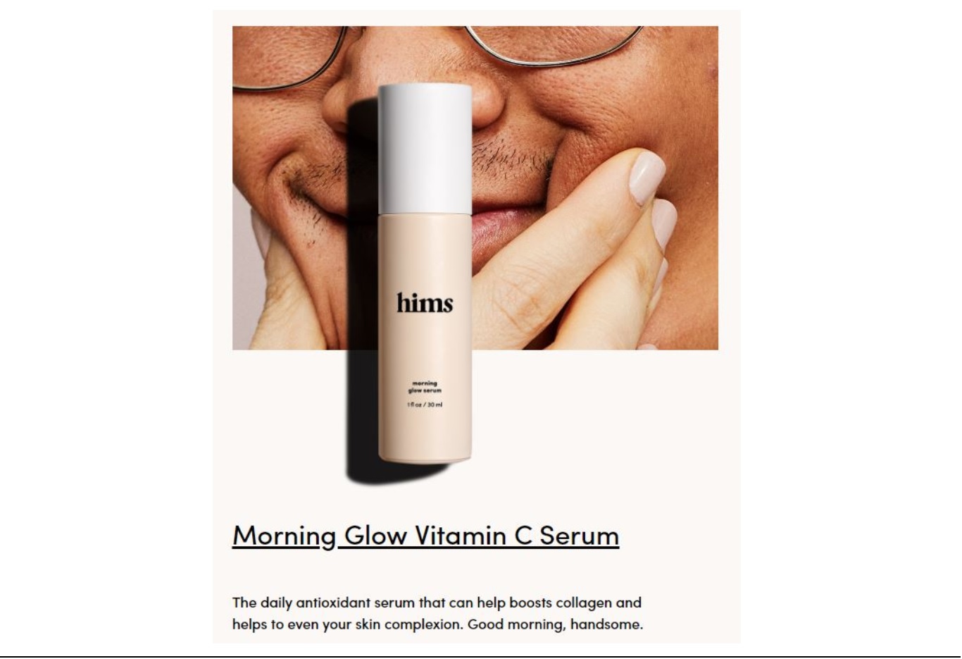 Hims is a brand that focuses on haircare, skincare, and health and wellness products for men. Along with hair kits to “cover all bases,” Hims’ haircare offering includes products to treat male pattern baldness and edible kits with vitamins that promote thicker hair and stronger nails. The brand’s skincare solutions include anti-aging kits, acne solutions for inflammation, vitamin C serums and wrinkle cream.