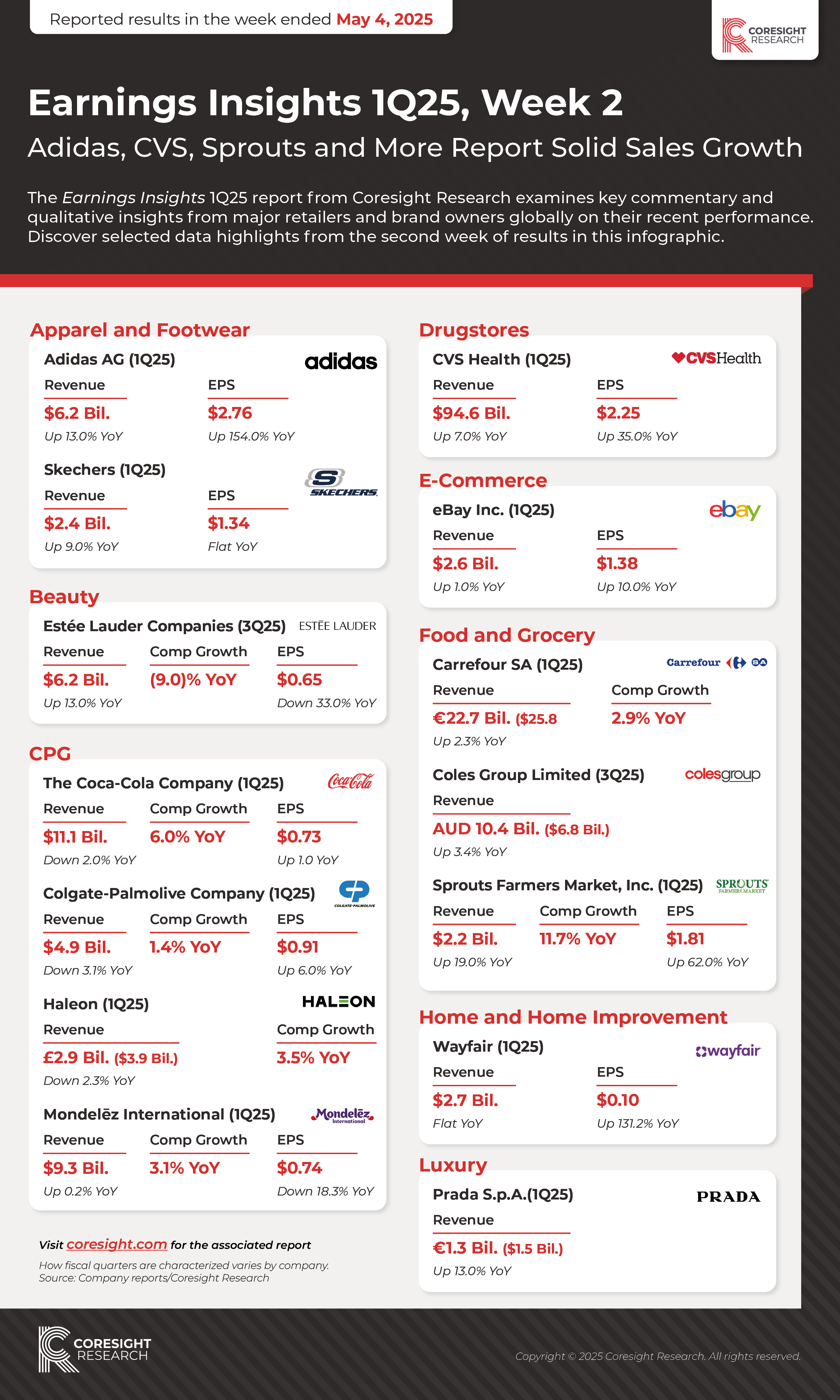 InfographicEarnings Insights 1Q25, Week 2: Adidas, CVS, Sprouts and More Report Solid Sales Growth—Infographic Coresight Research Sector Lead: John Mercer, Head of Global Research and Managing Director of Data-Driven Research May 7, 2025 Reasons to ReadDiscover the latest revenue and EPS (earnings per share) data from week two of the 1Q25 (first quarter of 2025) earnings season with this infographic, covering Coresight 100 companies that reported in the week ended May 4, 2025. Dive into the data behind this infographic with our full report: Earnings Insights 1Q25 Data in this infographic include: Quarterly revenue and EPS data (where applicable) from companies on our Coresight 100 list Companies mentioned in this infographic include: Adidas, The Coca-Cola Company, Colgate-Palmolive, CVS Health, Estée Lauder Companies, Haleon, Mondelēz International, Prada, Skechers, Sprouts Farmers Market, Wayfair Other relevant research: Explore all our Earnings Insights reports, including quarterly wrap-ups. The New Coresight 100: Leading the Retail Charge in 2025 The Corporate and Financial Developments Databank includes details of management changes, financial guidance updates and capital raised by major retail companies. This document was generated for Other research you may be interested in: Innovator Profile: Selectika—Enhancing Online Product Discovery Through Intelligent Metadata EnrichmentWalmart Investment Community Meeting 2025: From Low-Margin Retailer to Diversified, Digital Profit Engine, But Tariffs Create UncertaintyA Guide to NRF 2025: Retail’s Big Show—Six Game Changers Set to Reshape RetailSingles’ Day 2025 Around the World—Global Observations
