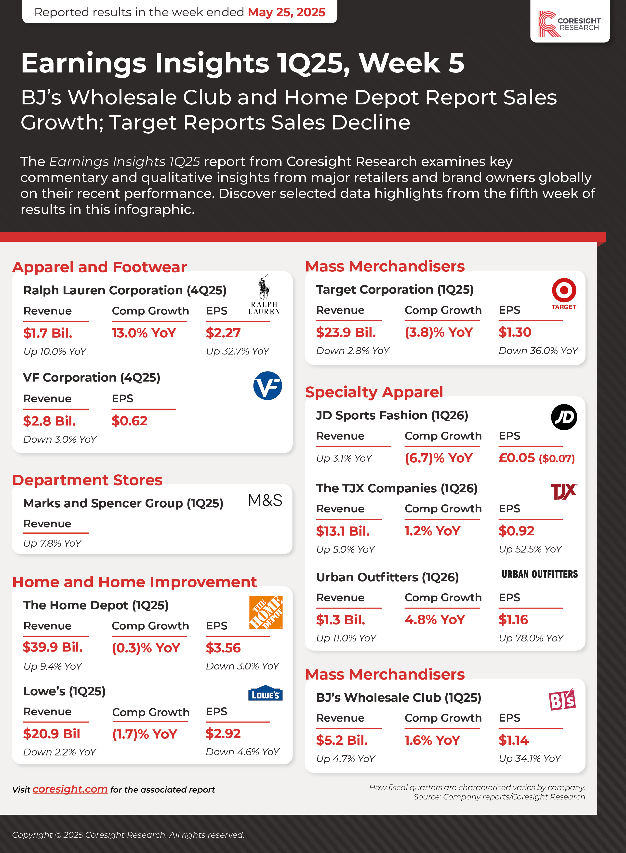 InfographicEarnings Insights 1Q25, Week 5: BJ’s Wholesale Club and Home Depot Report Sales Growth; Target Reports Sales Decline—Infographic Coresight Research Sector Lead: John Mercer, Head of Global Research and Managing Director of Data-Driven Research May 28, 2025 Reasons to ReadDiscover the latest revenue and EPS (earnings per share) data from week five of the 1Q25 (first quarter of 2025) earnings season with this infographic, covering Coresight 100 companies that reported in the week ended May 25, 2025. Dive into the data behind this infographic with our full report: Earnings Insights 1Q25 Data in this infographic include: Quarterly revenue and EPS data (where applicable) from companies on our Coresight 100 list Companies mentioned in this infographic include: BJ’s Wholesale Club, The Home Depot, JD Sports, Lowe’s, Marks and Spencer, Ralph Lauren, Target, The TJX Companies, VF Corporation, Urban Outfitters Other relevant research: Explore all our Earnings Insights reports, including quarterly wrap-ups. The New Coresight 100: Leading the Retail Charge in 2025 The Corporate and Financial Developments Databank includes details of management changes, financial guidance updates and capital raised by major retail companies. This document was generated for Other research you may be interested in: Holiday 2025 Survey Insights: Shopping Activity Builds Amid Black Friday WeekendBlack Friday 2025: Key Insights from US Stores—Solid Shopper Demand, Some True Doorbusters and Greater Omnichannel IntegrationRetail Crime and Shrink: US Shoppers Concerned About Theft Pushing Up Prices; Shoplifting Surges to Record Levels in EnglandAnalyst Corner: US Mass Merchandisers, Warehouse Clubs and Discount Stores—Target in Transition as Dollar Stores and Clubs Surge Ahead, With Sujeet Naik