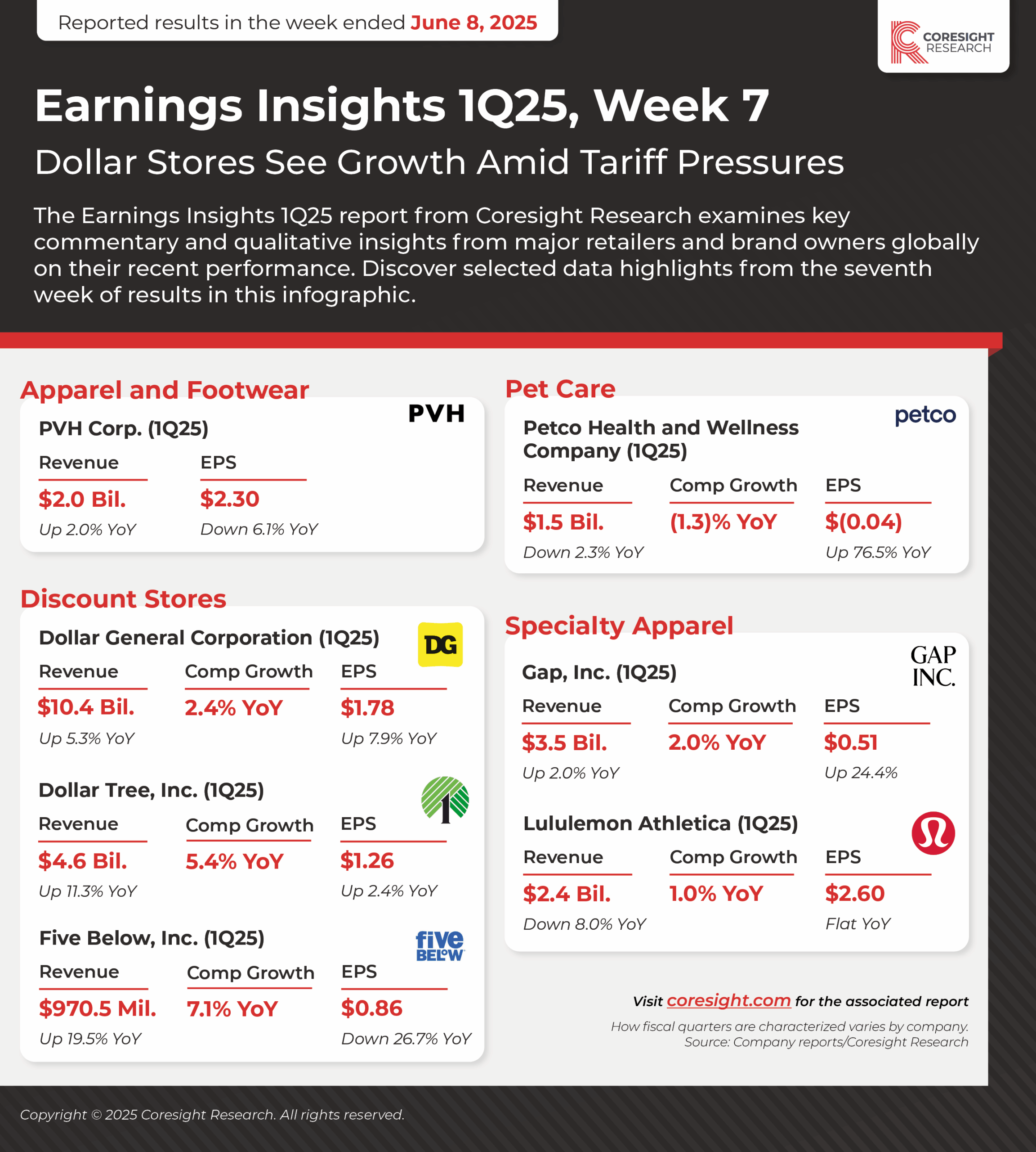 InfographicEarnings Insights 1Q25, Week 7: Dollar Stores See Growth Amid Tariff Pressures—Infographic Coresight Research Sector Lead: John Mercer, Head of Global Research and Managing Director of Data-Driven Research June 10, 2025 Reasons to ReadDiscover the latest revenue and EPS (earnings per share) data from week seven of the 1Q25 (first quarter of 2025) earnings season with this infographic, covering Coresight 100 companies that reported in the week ended June 8, 2025. Dive into the data behind this infographic with our full report: Earnings Insights 1Q25 Data in this infographic include: Quarterly revenue and EPS data (where applicable) from companies on our Coresight 100 list Companies mentioned in this infographic include: Dollar General Corporation, Dollar Tree, Five Below, Gap Inc., Lululemon Athletica, Petco Health and Wellness Company, PVH Corp. Other relevant research: Explore all our Earnings Insights reports, including quarterly wrap-ups. The New Coresight 100: Leading the Retail Charge in 2025 The Corporate and Financial Developments Databank includes details of management changes, financial guidance updates and capital raised by major retail companies. This document was generated for Other research you may be interested in: US CPG Sales Tracker: E-Commerce Sustains Double-Digit Growth Rate; In-Store Sales Expansion SlowsWeekly UK Store Openings and Closures Tracker 2025, Week 34: The Sleep Haven Files for AdministrationHigher-Income Sentiment Declines; Holiday Shopping Lull Before a Promotional Surge: US Consumer Survey Insights2026 Sector Outlook: US Beauty Retailing—Fragrance, GLP-1 and Science-Led Innovation To Drive Expansion