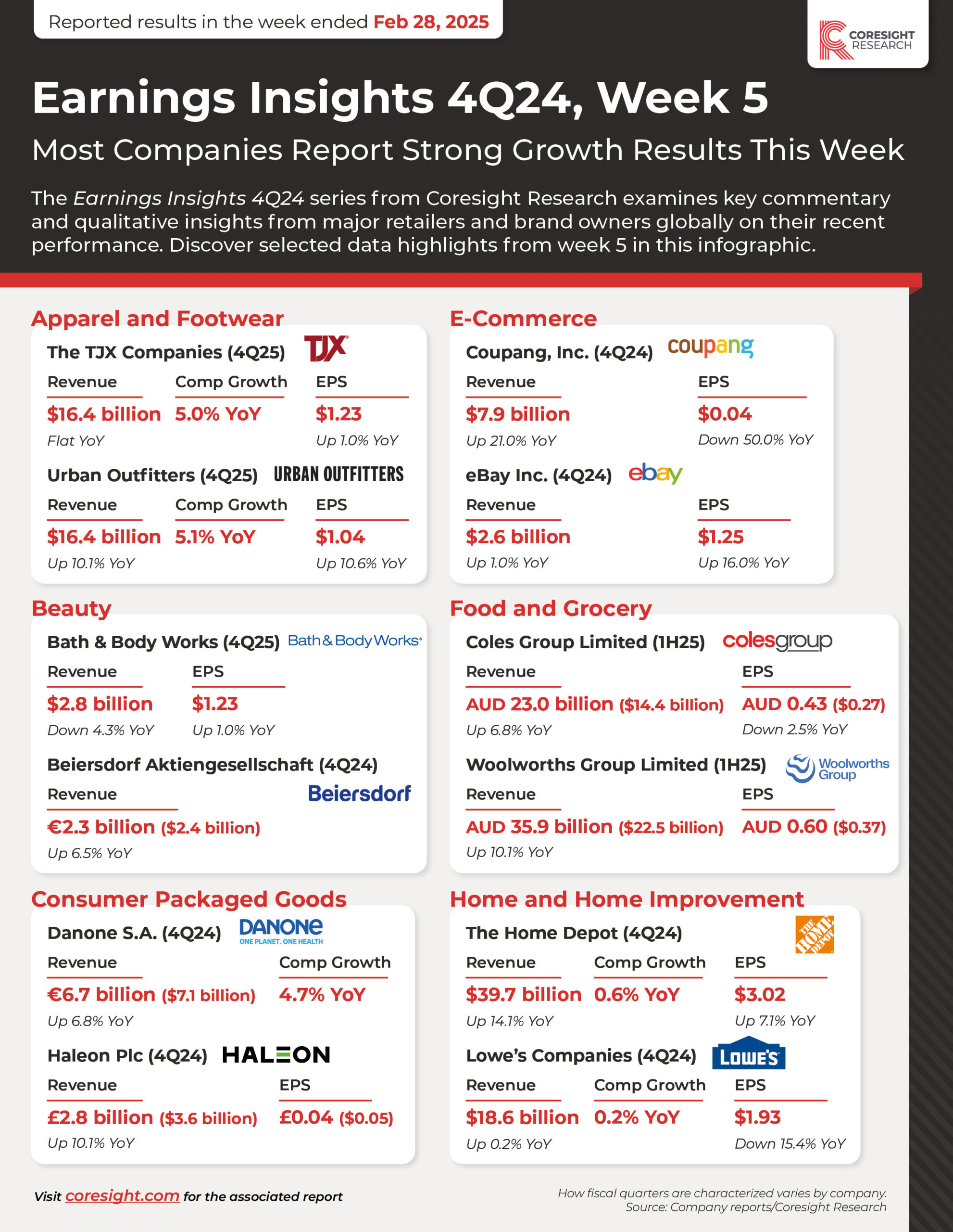 InfographicEarnings Insights 4Q24, Week 5: Most Companies Report Strong Growth Results This Week—Infographic Coresight Research Sector Lead: John Mercer, Head of Global Research and Managing Director of Data-Driven Research March 5, 2025 Reasons to ReadDiscover the latest revenue and EPS (earnings per share) data from week five of the 4Q24 (fourth quarter of 2024) earnings season with this infographic, covering various companies that reported in the week, including Bath & Body Works, The Home Depot and The TJX Companies, among others. Dive into the research report behind this infographic: Earnings Insights 4Q24, Week 5: Most Companies Report Strong Growth Results This Week Data in this infographic include: Quarterly revenue and EPS data (where applicable) from companies on our Coresight 100 list Companies mentioned in this infographic include: Bath & Body Works, Beiersdorf, Coles Group, Coupang, Danone, eBay, Haleon, The Home Depot, Lowe’s, The TJX Companies, Urban Outfitters, Woolworths Group Other relevant research: Explore all our Earnings Insights reports, including quarterly wrap-ups. The New Coresight 100: Leading the Retail Charge in 2025 The Corporate and Financial Developments Databank includes details of management changes, financial guidance updates and capital raised by major retail companies. This document was generated for Other research you may be interested in: Unlock the Untapped Potential of AI-Powered MarTech: Coresight Research Premium Subscriber Call, April 2025A Guide to NRF 2025: Retail’s Big Show—Six Game Changers Set to Reshape RetailAI in Retail: What’s Now and What’s Next—Premium Subscriber Call, November 2025Seasonal Shopping, 1Q25—Expectations for Valentine’s Day and Presidents’ Day: US Consumer Survey Insights Extra