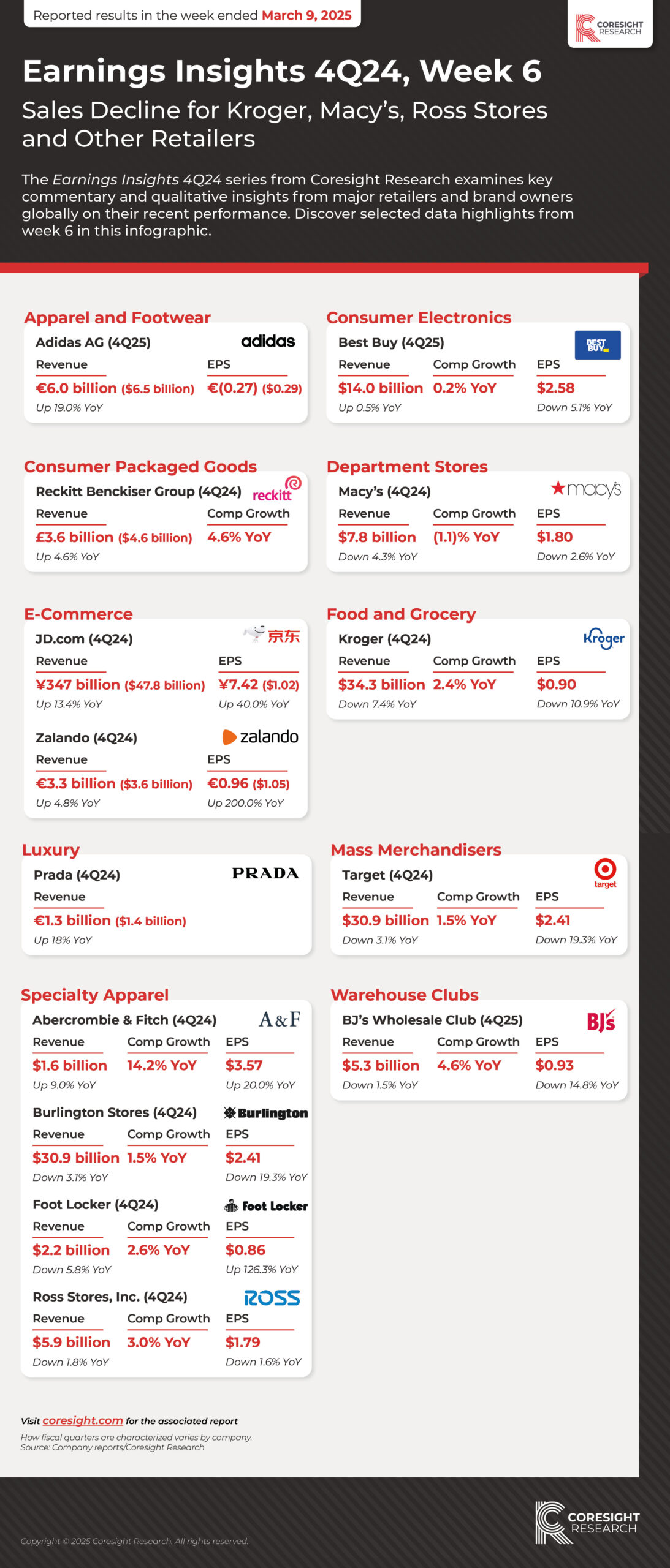 InfographicEarnings Insights 4Q24, Week 6: Sales Decline for Kroger, Macy’s, Ross Stores and Other Retailers—Infographic Coresight Research Sector Lead: John Mercer, Head of Global Research and Managing Director of Data-Driven Research March 12, 2025 Reasons to ReadDiscover the latest revenue and EPS (earnings per share) data from week six of the 4Q24 (fourth quarter of 2024) earnings season with this infographic, covering various companies that reported in the week, including Adidas, Burlington Stores, Macy’s and Zalando, among others. Dive into the research report behind this infographic: Earnings Insights 4Q24, Week 6: Sales Decline for Kroger, Macy’s, Ross Stores and Other Retailers Data in this infographic include: Quarterly revenue and EPS data (where applicable) from companies on our Coresight 100 list Companies mentioned in this infographic include: Abercrombie & Fitch, Adidas, Best Buy, BJ’s Wholesale Club, Burlington Stores, Foot Locker, Macy’s, JD.com, Kroger, Prada, Reckitt Benckiser, Ross Stores, Target, Zalando Other relevant research: Explore all our Earnings Insights reports, including quarterly wrap-ups. The New Coresight 100: Leading the Retail Charge in 2025 The Corporate and Financial Developments Databank includes details of management changes, financial guidance updates and capital raised by major retail companies. This document was generated for Other research you may be interested in: Positivity About Personal Finances Continues: Weekly US Consumer Sentiment, Week 27, 2025—InfographicRetail 2025: 10 Trends Shaping the Retail Media MarketWeekly UK Store Openings and Closures Tracker 2025, Week 13: Kingfisher Announces Store Expansion Plans; Whole Foods Opens New London StoreSector Focus: Off-Price Shopping—Data Graphic