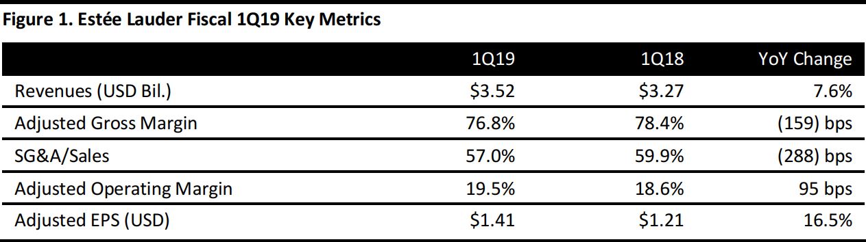 Insight Report 4 minutesFree ReportEstée Lauder (EL) 1Q19 Results: Company Beats Expectations and Raises Guidance Coresight Research November 6, 2018 Executive Summary Estée Lauder reported fiscal 1Q19 revenues of $3.52 billion, up 7.6% year over year and higher than the consensus estimate of $3.47 billion. Adjusted earnings per share (EPS) was $1.41, higher than the consensus estimate of $1.22 and higher than the EPS of $1.21 in the year ago period. Comparable sales were up 11% at Estée Lauder. For the second quarter, the company provided EPS guidance of $1.47–$1.50, compared to the consensus estimate of $1.63. Net sales are forecast to increase 4%–5%, compared to consensus estimate of 4.6%. For the full year, Estée Lauder raised its EPS guidance to $4.73–$4.82, up from $4.62–$4.71, compared to the consensus estimate of $4.77. The company provided revenue guidance of 4.5%, implying $12.75 billion. Source: Company reports/Coresight Research Fiscal 1Q19 Results Estée Lauder reported fiscal 1Q19 revenues of $3.52 billion, up 7.6% year over year and higher than the consensus estimate of $3.47 billion. Adjusted earnings per share (EPS) was $1.41, higher than the consensus estimate of $1.22 and higher than EPS of $1.21 in the year ago period. The company reported that comparable sales were up 11% overall in the period, which made it the sixth consecutive quarter of double-digit sales increases. Segment Update: Skin Care Increasing in Nearly Every Channel By segment, net sales in Skin Care grew by 16.5%, from $1.28 billion to $1.49 billion on a reported basis. The company reported that Skin Care grew in nearly every channel and segment, and experienced particularly strong growth in Asia, travel retail and online. The segment saw growth in La Mer (Estée Lauder’s luxury skin care brand) with net sales increasing in every region and channel, driven by higher net sales of both existing and new products, which includes The Treatment Lotion Hydrating Mask. Estée Lauder also launched the Advanced Night Repair Eye Supercharged Complex, which also contributed to overall sales in Skin Care during the quarter. The Makeup segment’s net sales increased by 2% on a reported basis, from $1.37 billion to $1.41 billion, driven by increases in MAC, Estée Lauder and Tom Ford Beauty. Estée Lauder’s Double Wear line of products drove double-digit growth, as did Tom Ford’s lip- and eye-shadow lines. These increases were offset by lower net sales of Clinique and Smashbox makeup sales. Net sales in the Fragrance segment decreased by 1% on a reported basis, from $476 million to $472 million, driven by the adoption of the new accounting standard, ASC 606; excluding the adoption of ASC 606, the fragrance segment saw increased net sales in Tom Ford Beauty, Le Labo, By Kilian and Jo Malone London, and growth in “Private Blend” fragrances including the launch of Tom Ford’s Ombre Leather and the extended reach of Jo Malone with the launch of the fragrance on Tmall in China. Net sales in the Hair Care segment increased by 5.1% on a reported basis, from $136 million to $143 million due to growth from Aveda’s Invati Advanced product line and the launch of Cherry Almond Softening Shampoo and Conditioner. Geography Update: Strongest Growth in APAC By geography, APAC led net sales, growing by 24% on a reported basis. The company highlighted that sales in China and Hong Kong rose in strong double digits with broad-based growth across brands, categories and channels, and prestige beauty growth and department stores continued to grow more than 20%, and online sales more than doubled. The company reported that net sales in Europe, the Middle-East region and Africa rose 14% on a reported basis, driven by strong double-digit increases in the global travel retail business and emerging markets. Net sales in the Americas declined 7%, while North America continued to achieve double-digit growth in specialty multi-retail and online. Third-Party Platform Expansion: Tmall, ASOS and Global Travel Retail Estée Lauder reported that it is continuing to expand its brand on third-party platforms; it launched its Jo Malone fragrance brand on Tmall in China and launched five more brands on ASOS in the UK. The company highlighted that its Global Travel Retail business is rapidly growing and is experiencing broad-based growth across brands and countries, with eight of the top 10 brands growing in double digits in retail in the channel. Outlook For the second quarter, the company provided EPS guidance of $1.47–$1.50, compared to the consensus estimate of $1.63. Net sales are forecast to increase 4%–5%, compared to the consensus estimate of 4.6%. For the full year, Estée Lauder raised its EPS guidance to $4.73–$4.82, up from $4.62–$4.71, compared to the consensus estimate of $4.77. The company provided revenue guidance of 4.5%, implying $12.75 billion. This document was generated for Other research you may be interested in: Test post for search