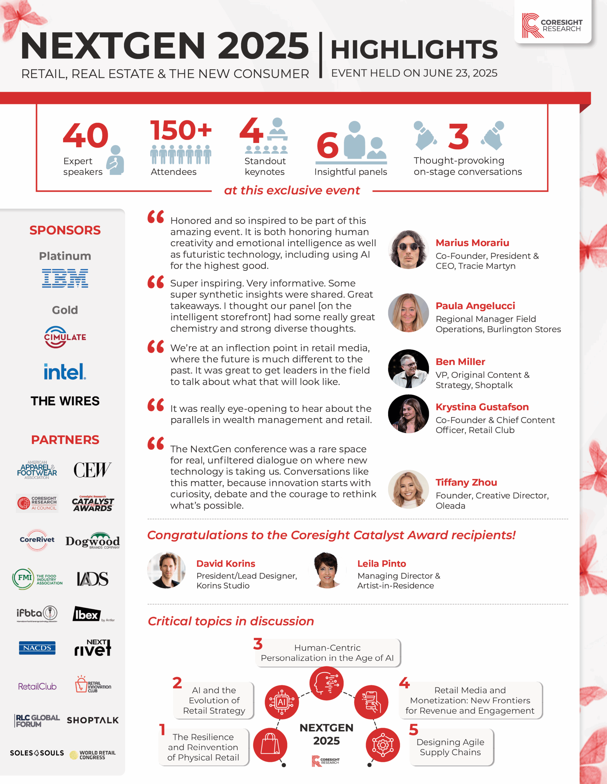InfographicHighlights from NextGen 2025: Retail, Real Estate & the New Consumer—Infographic Coresight Research June 24, 2025 Reasons to ReadOn June 23, 2025, NextGen 2025: Retail, Real Estate + the New Consumer brought together a curated mix of leaders and innovators to dive into the shifts reshaping how we build, operate and connect. The event agenda put a sharp focus on AI (artificial intelligence), the evolving consumer and the spaces where commerce comes to life. Which key themes emerged, and what did panelists think of the event? This free infographic offers highlights from the Coresight Research conference. Thank you to NextGen 2025’s platinum sponsor, IBM, and to gold sponsors Intel, Cimulate AI and The Wires. Other relevant research: Premium subscribers can access comprehensive insights from the event in our in-depth report, Shaping What’s Next in Retail—Physical Retail, AI, Retail Media: Insights from NextGen 2025, a Coresight Research Conference Visit the Coresight Research Retail Technology Hub to explore reports, data and competitive landscapes on technology. This document was generated for Other research you may be interested in: Retail 2025: 10 AI Trends—An Inflection Point in the GenAI RevolutionMarket Outlook: US Convenience Store Retailing—Charting New Paths Through Structural HeadwindsHoliday 2025: Navigating Social Commerce—Top Strategies for Maximizing Engagement This Holiday SeasonKroger and Instacart Expand Partnership To Advance Agentic Shopping and Accelerate Delivery Efficiency