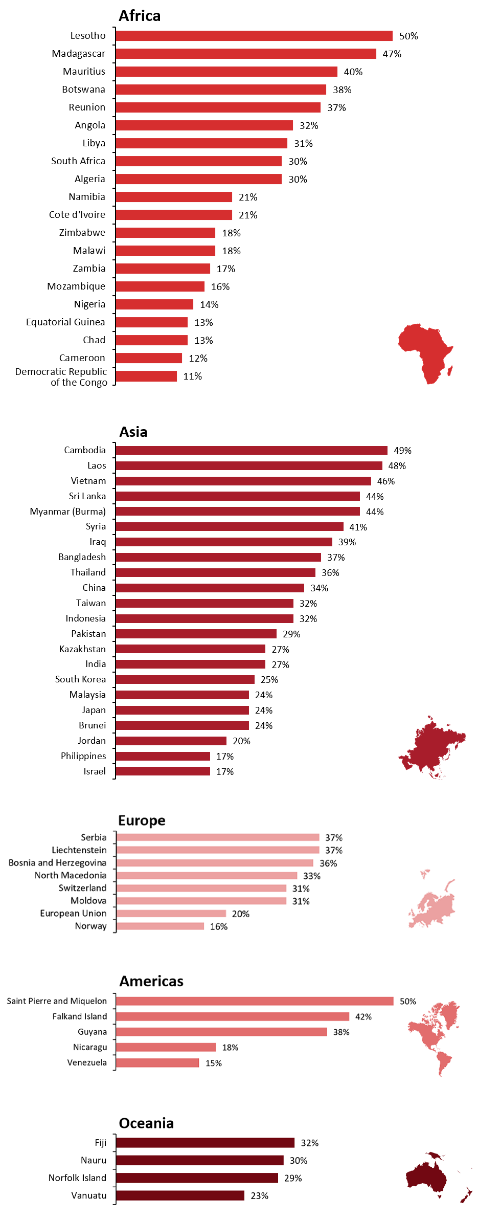 Insight ReportMapping the US’s Reciprocal Import Tariffs: Which Nations Are Affected? Coresight Research April 3, 2025 Reasons to ReadOn April 2, 2025, dubbed “Liberation Day” by US President Trump, the US announced reciprocal tariffs that American businesses will have pay to import products from dozens of nations. We provide the full list of reciprocal tariffs, and chart the import rates of affected nations by continent. Other relevant research: Webinar replay—Adapting to Tariff Pressures: Strategies for Retail Success US Tariffs on Canada and Mexico: What US Consumers Think Inflation Up, Sentiment Down: Alarm Bells for the US Consumer Economy? New Tariffs, New Challenges: How US Trade Policies Could Impact Prices and Profits Retail 2025: US Macro, Consumer and Retail Outlook Reciprocal Tariffs Announced by the US On April 2, 2025, dubbed “Liberation Day” by US President Trump, the US announced reciprocal tariffs that American businesses will have pay to import products from dozens of nations. These tariffs, which will come into effect on April 9, 2025, are on top of a baseline tariff of 10% on all imports, effective April 5, 2025. This means that, for example, imports from China will be subject to the nation’s 34% reciprocal tariff as well as the previously announced 10% tariff and the across-the-board 10% tariff. We chart the reciprocal tariffs by nation (categorized by continent) below and provide the full list, in alphabetical order, in the appendix. Figure 1. Reciprocal Import Tariffs Announced by the US (Countries Categorized by Continent, Charted in Descending Order by Tariff Rate) Announced April 2, 2025; To come into effect on April 9, 2025 Source: The White House/Coresight Research Appendix Appendix Figure 1. The Full List of Reciprocal Import Tariffs Announced by the US (Listed in Alphabetical Order) Algeria: 30% Fiji: 32% Malaysia: 24% Saint Pierre and Miquelon: 50% Angola: 32% Guyana: 38% Mauritius: 40% Serbia: 37% Bangladesh: 37% India: 27% Moldova: 31% South Africa: 30% Bosnia and Herzegovina: 36% Indonesia: 32% Mozambique: 16% South Korea: 25% Botswana: 38% Iraq: 39% Myanmar (Burma): 44% Sri Lanka: 44% Brunei: 24% Israel: 17% Namibia: 21% Switzerland: 31% Cambodia: 49% Japan: 24% Nauru: 30% Syria: 41% Cameroon: 12% Jordan: 20% Nicaragua: 18% Taiwan: 32% Chad: 13% Kazakhstan: 27% Nigeria: 14% Thailand: 36% China: 34% Laos: 48% Norfolk Island: 29% Tunisia: 28% Cote d’Ivoire: 21% Lesotho: 50% North Macedonia: 33% Vanuatu: 23% Democratic Republic of the Congo: 11% Libya: 31% Norway: 16% Venezuela: 15% Equatorial Guinea: 13% Liechtenstein: 37% Pakistan: 29% Vietnam: 46% European Union: 20% Madagascar: 47% Philippines: 17% Zambia: 17% Falkland Islands: 42% Malawi: 18% Reunion: 37% Zimbabwe: 18% Source: The White House This document was generated for Other research you may be interested in: Amazon Prime Day 2025: Preview—Five Essential Insights on Consumers’ Shopping PlansEarnings Insights 4Q24, Week 1: Levi Strauss, P&G, Walgreens and Others Post Sales Growth, While Burberry and Kimberly-Clark Report DeclinesAI Insights: Instacart CEO Fidji Simo To Join OpenAI as CEO of ApplicationsThe State of In-Store Retailing 2025: The Dawn of New-Age Stores, Powered by Technology