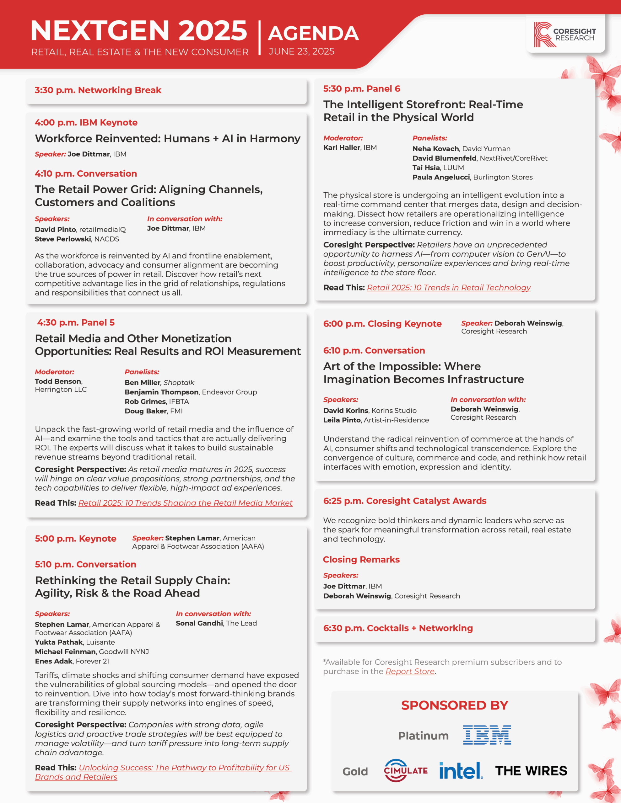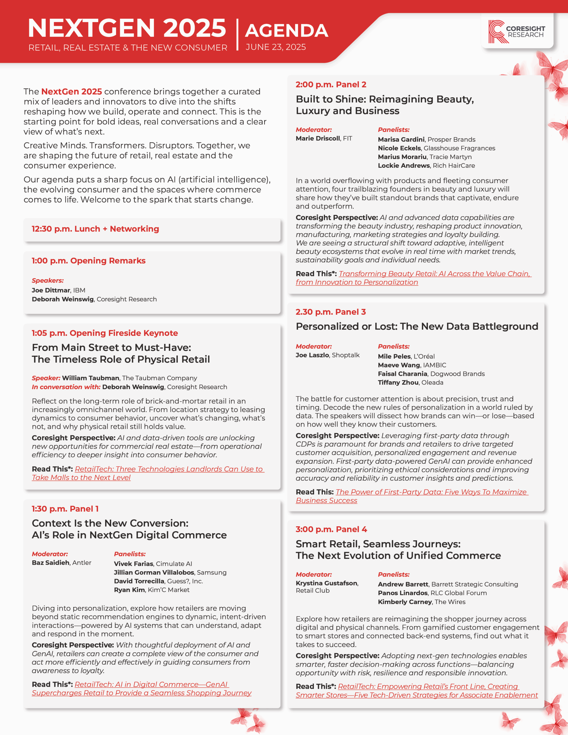 Event CoverageNextGen 2025: Retail, Real Estate & the New Consumer—Agenda Coresight Research June 23, 2025 Reasons to ReadOn June 23, 2025, the NextGen 2025: Retail, Real Estate + the New Consumer conference will bring together a curated mix of leaders and innovators to dive into the shifts reshaping how we build, operate and connect. This is the starting point for bold ideas, real conversations and a clear view of what’s next. Creative Minds. Transformers. Disruptors. Together, we are shaping the future of retail, real estate and the consumer experience. Our agenda puts a sharp focus on AI (artificial intelligence), the evolving consumer and the spaces where commerce comes to life. Welcome to the spark that starts change. Joining Deborah Weinswig, CEO and Founder of Coresight Research, in our incredible speaker lineup are experts from the following companies (and more): American Apparel & Footwear Association (AAFA), David Yurman, Dogwood Brands, Guess?, L’Oréal, Samsung, The Taubman Company Thank you to NextGen 2025’s platinum sponsor, IBM, and to gold sponsors Intel, Cimulate AI and The Wires. Other relevant research: The Power of First-Party Data: Five Ways To Maximize Business Success Unlocking Success: The Pathway to Profitability for US Brands and Retailers Retail 2025: 10 Trends Shaping the Retail Media Market Retail 2025: 10 Trends in Retail Technology Transforming Beauty Retail: AI Across the Value Chain, from Innovation to Personalization Visit the Coresight Research Retail Technology Hub to explore reports, data and competitive landscapes on technology. This document was generated for Other research you may be interested in: Inconsistent Trends Appear to Reflect Uncertainty: Weekly US Consumer Sentiment, Week 31, 2025—InfographicUS CPG Sales Tracker: Homecare and Health Dominate at the Start of 2025September 2025 US Retail Sales Outlook: Retail Outlook Score Plummets; Holiday-Quarter Growth Projection ModeratesSentiment Holds Steady As August Tariffs Deadline Looms: China Consumer Survey Insights
