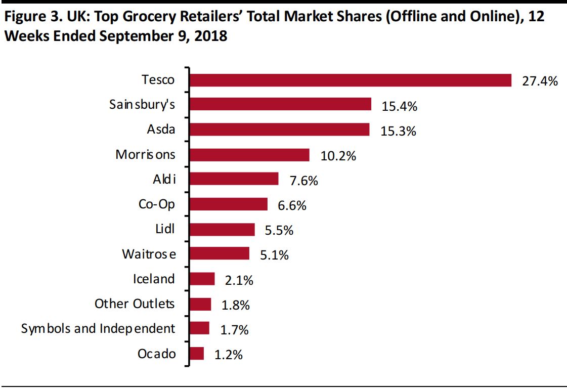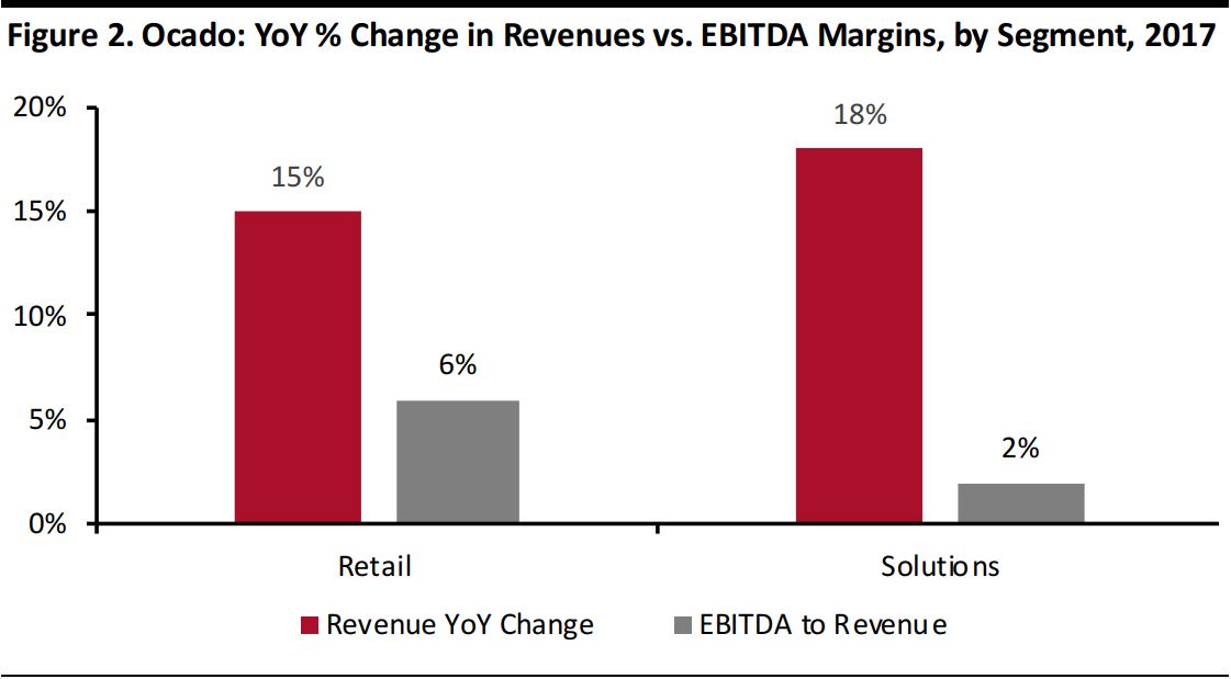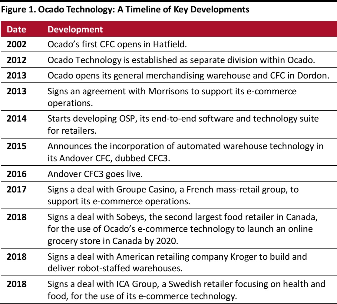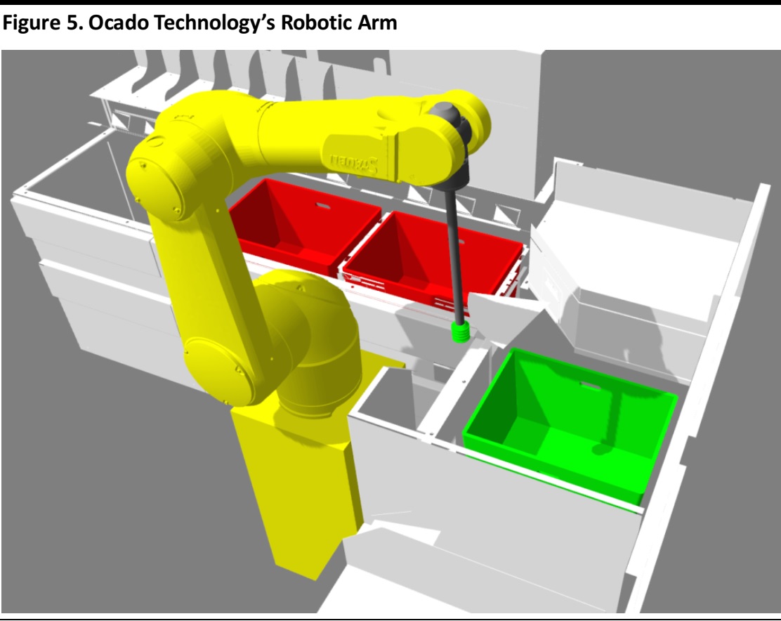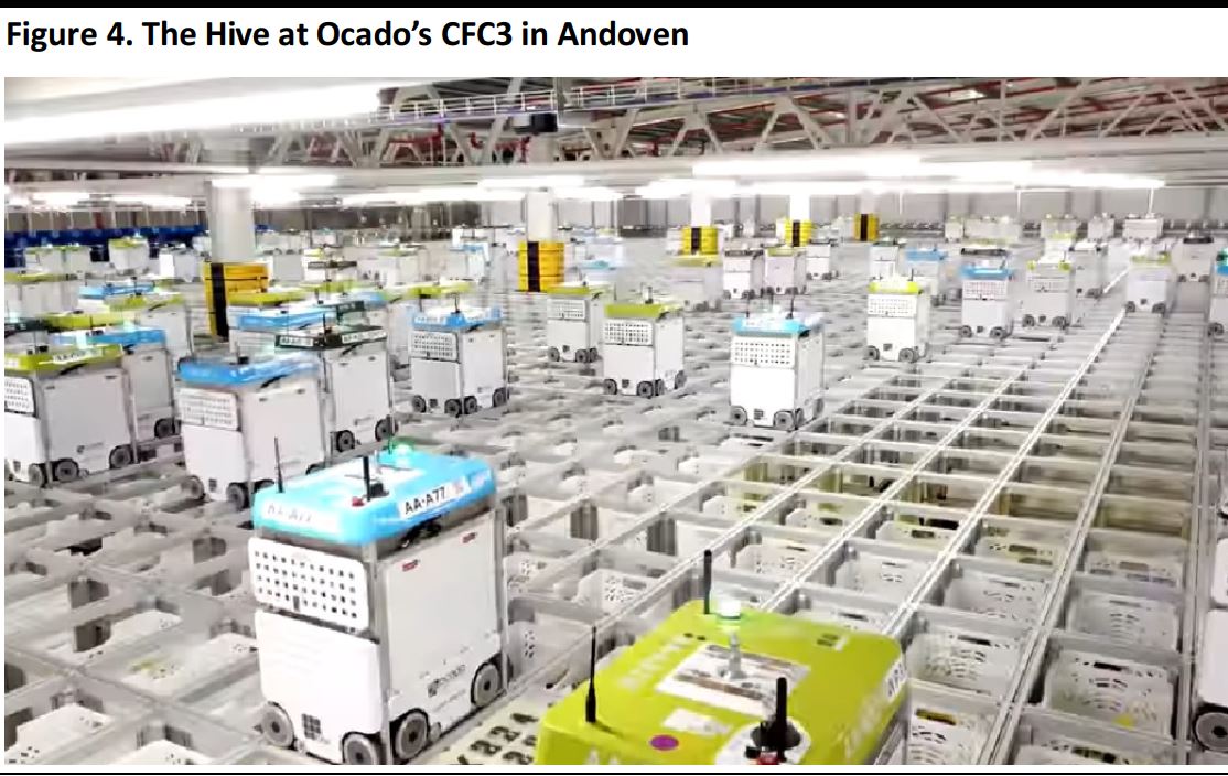 Insight Report 8 minutesFree ReportOcado’s Robot-Staffed Distribution Centers: Automating Grocery E-Commerce Coresight Research November 6, 2018 Executive SummaryOcado has been evolving from an e-commerce grocery retailer to a technology company that develops innovative approaches to warehouse automation. This report illustrates Ocado’s dramatic transformation into a company that develops innovative and cutting-edge warehouse automation solutions, even as it continues with its core business of selling groceries online. Ocado’s transformation into a technology provider has enabled it to diversify its sources of revenue and profitability. Ocado’s latest-generation distribution center includes a dense 3D-grid—dubbed the Hive—in which layers of crates containing grocery products are stacked. Swarms of robots move across the grid to collect crates and take them to picking stations where (human) employees pick the individual items needed to fill customer orders. Retailers that have started using Ocado’s warehouse automation solutions are enjoying the benefits of Ocado’s innovative systems but have risked giving away control of their distribution operations. Ocado is redesigning grocery e-commerce warehousing with its robot-staffed customer fulfillment centers (CFCs) and the Ocado Smart Platform (OSP). Introduction Ocado has evolved from an e-commerce grocery retailer to a technology company that develops innovative approaches to warehouse automation. It has sold its technology to grocery retailers such as Kroger in the US, Sobeys in Canada, Groupe Casino in France and ICA in Sweden. This report illustrates the company’s transformation into a technology provider and gives an overview of how the company’s robotics distribution centers and the suite that supports e-commerce distribution—Customer Fulfillment Centers (CFC) in Andover, UK, and Ocado Smart Platform (OSP) respectively—work. Ocado’s Journey from Grocery Retailer to Technology Vendor Founded as an online-only supermarket in April 2000 by former investment bankers Jonathan Faiman, Jason Gissing and Tim Steiner, Ocado has made a name for itself in recent years as a technology company with expertise in warehouse automation. The company’s success in transforming its own online grocery business was a process that required in-house research and development of proprietary robots, machinery and software. Ocado now licenses the use of its warehouse automation technology to third-party retailers. Figure 1 is a timeline of the key events of Ocado as a technology company. Source: Ocado Technology/Coresight Research Ocado’s technology business already generates an additional stream of revenue and profits. Ocado’s valuation rests in part on that technology increasing its contribution in the long run as the company inks deals with more retailers. Though the company’s e-commerce business is currently a more profitable business, Ocado Technology is growing at faster rate, as shown in Figure 2. Data are for the fiscal year ended December 3, 2017. Retail includes online groceries and general merchandise offerings to customers in the UK; Solutions includes end-to-end online retail solutions provided to corporate customers in the UK and internationally. Source: Company reports/Coresight Research Diversification should help mitigate Ocado’s relative lack of scale: as we show below, Ocado has a UK grocery market share of just over 1%. Source: Kantar Worldpanel Ocado is planning to expand the scope of its logistics management technology beyond grocery e-commerce to cover other sectors such as automotive and transportation, which will soon see the entry of autonomous vehicles. Ocado’s Robot-Staffed Distribution Centers At CFC3 in Andover, UK, Ocado has developed a new approach to warehousing automation, shifting from a system based on conveyor belts (in operation in other Ocado sites, including Hatfield, UK) to one centered around a dense 3D-grid—dubbed the Hive—in which layers of crates containing grocery products are stacked. Swarms of robots—which communicate with each other using a proprietary 4G-based protocol—move across the grid to collect crates and take them to picking stations where (human) employees pick the individual items needed to fill customer orders. The proprietary 4G technology used at CFC3allows connections with a frequency of ten times per second with the 1,000+ robots moving around the warehouse and working within a 150 meter radius, according to Ocado Technology. The advantages that the Hive’s system has over the traditional warehouse structure (based on conveyer belts) include easier scalability, and reduction in both the warehouse space required and average time taken fill customers’ orders. Ocado Technology says that the Hive’s system can “pick”a grocery item every six seconds and fill a 50-item order in around five minutes. Source: Ocado Technology Robotic Arm and Collaborative Robot Ocado is continuing with its research and development to improve the logistics of grocery e-commerce. The company is carrying out high-profile research projects, including SoMa and SecondHands, which are a soft manipulation system and a robot assistant, respectively. The SoMa project is a European Union-funded, Horizon 2020 programme for research and innovation in the field of humanoid robots, and the Ocado’s partners in the SecondHands project are four eminent institutions: Karlsruhe Institute of Technology, which is building the robot; University College London, which is providing the robot’s vision system; Sapienza Università di Roma, which is supplying the actual intelligence for the system; and Ecole Polytechnique Fédérale de Lausanne, which is providing the robot with bi manual manipulation. Ocado Technology has also been developing a robotic arm capable of picking up the 50,000+ items that feature in the company’s online catalog. The arm is equipped with a pipe running to an air compr