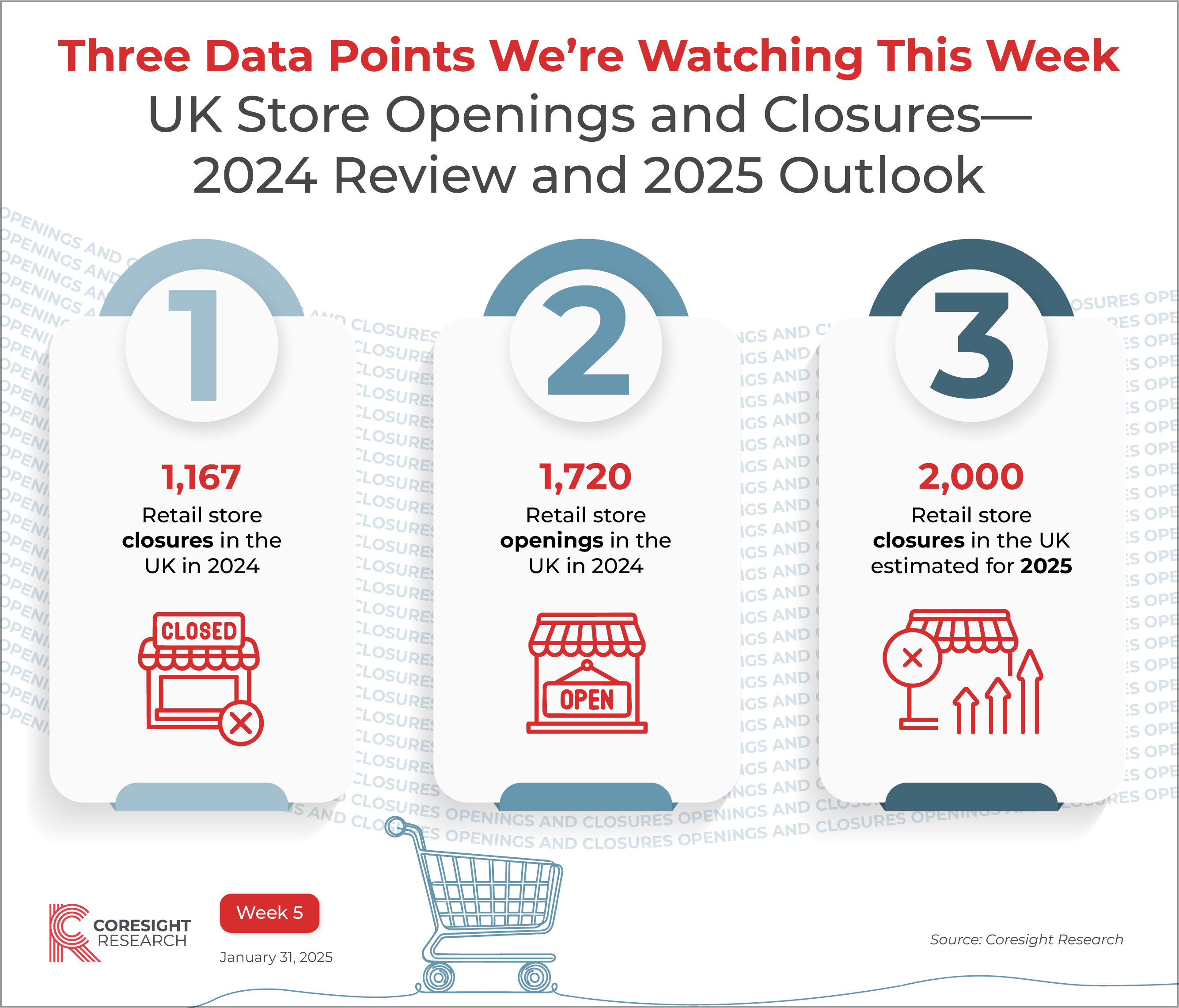 InfographicThree Data Points We’re Watching This Week UK Store Openings and Closures—2024 Review and 2025 Outlook John Mercer, Head of Global Research and Managing Director of Data-Driven Research January 31, 2025 Reasons to ReadOur Three Data Points We’re Watching This Week series spotlights key data points from this week’s research. How is the retail store landscape changing in the UK? Discover key data points we are watching in week 5 of 2025, with a focus on actual store closures and openings in 2024 and our projections for 2025. Dive into the full research report behind these data points: Store Tracker Extra: UK Store Openings and Closures—2024 Review and 2025 Outlook Other relevant research: The full collection of Store Tracker reports More research on physical retail and real estate The US and UK Store Tracker Databank is the definitive resource for information on store openings and closures by sector in the US and UK retail industries. All graphics in the Three Data Points series This document was generated for Other research you may be interested in: Diwali’s Global Rise Is Reshaping the Retail Growth CycleStore Tracker Extra: UK Store Openings and Closures 2024 Review and 2025 Outlook—InfographicAnalyst Corner: US Consumer Sentiment Varies by Age and Income—Uncovering Demographic Trends, with Aditya KaushikUS Beauty Retailing: Themes, Concepts and Innovators—Personalization, Tech Integration and Wellness To Drive Change