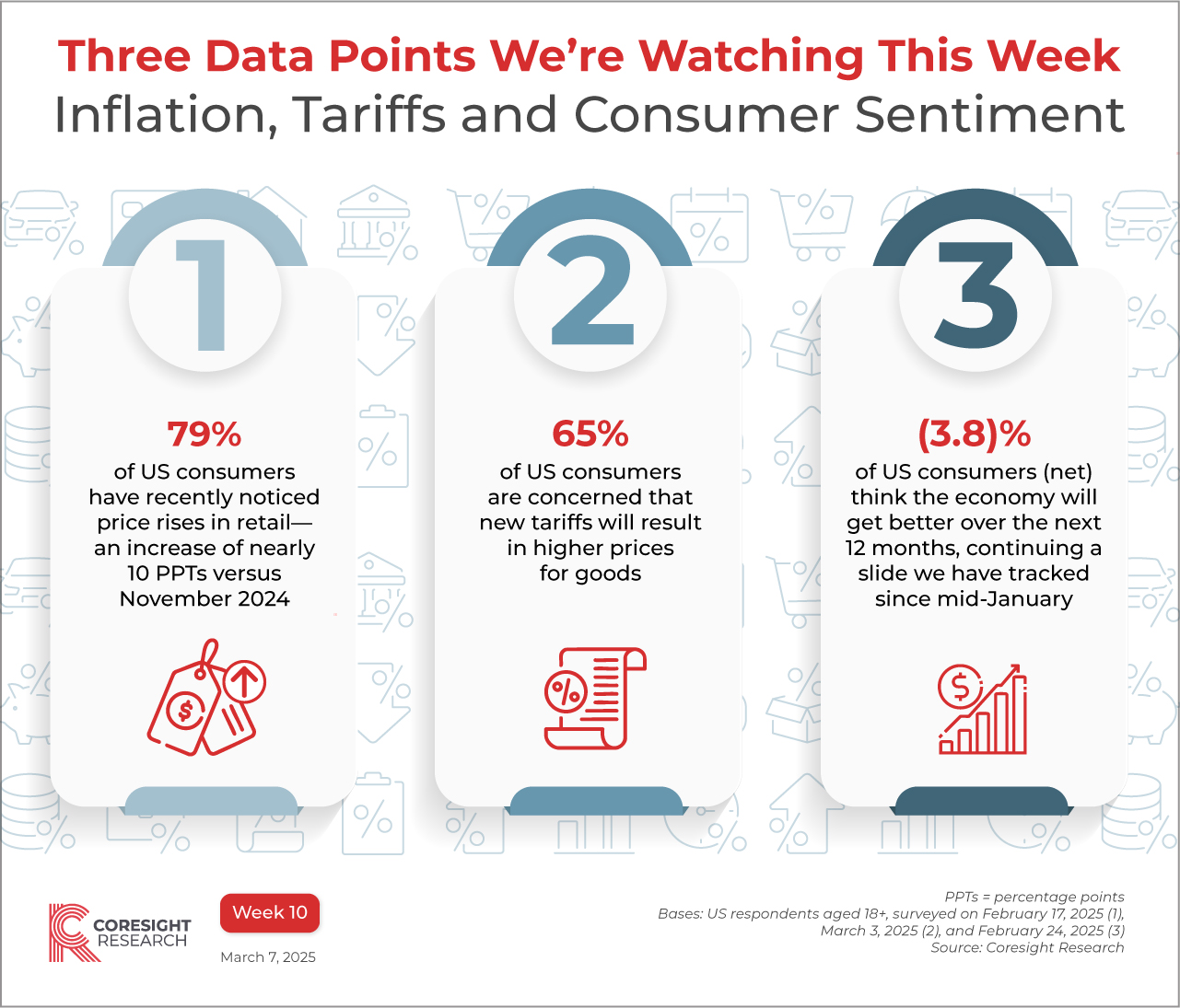 InfographicThree Data Points We’re Watching This Week, Week 10: Inflation, Tariffs and Consumer Sentiment John Mercer, Head of Global Research and Managing Director of Data-Driven Research March 7, 2025 Reasons to ReadOur Three Data Points We’re Watching This Week series spotlights key data points from this week’s research. Discover key data points we are watching in week 10 of 2025. This week, we focus on US consumer perceptions of inflation, tariffs and the economy, presenting highlights from our survey-driven research. Dive into the full research report behind these data points: 1 & 3. Inflation Awareness Rises; Economic Sentiment Falls to Six-Month Low: US Consumer Survey Insights 2. US Tariffs on Canada and Mexico: What US Consumers Think Other relevant research: Inflation Up, Sentiment Down: Alarm Bells for the US Consumer Economy? New Tariffs, New Challenges: How US Trade Policies Could Impact Prices and Profits Retail 2025: US Macro, Consumer and Retail Outlook All our coverage of the consumer and macroeconomics The Coresight Research US Consumer Survey Databank provides additional insight into US consumer behaviors from our weekly surveys. All graphics in the Three Data Points series This document was generated for Other research you may be interested in: How Will Tariffs Impact China’s Singles’ Day 2025? Six Months To Go—What Brands and Retailers Need to KnowWeekly US Store Openings and Closures Tracker 2025, Week 38: Global Names, Including LEGO, Monos and Uniqlo, Continue to ExpandNew Tariffs, New Challenges: How US Trade Policies Could Impact Prices and ProfitsCEO Brief: Tech for Tariffs—Four Technologies (and Services) That Can Raise Revenues and Margins Now to Offset Tariff Pain