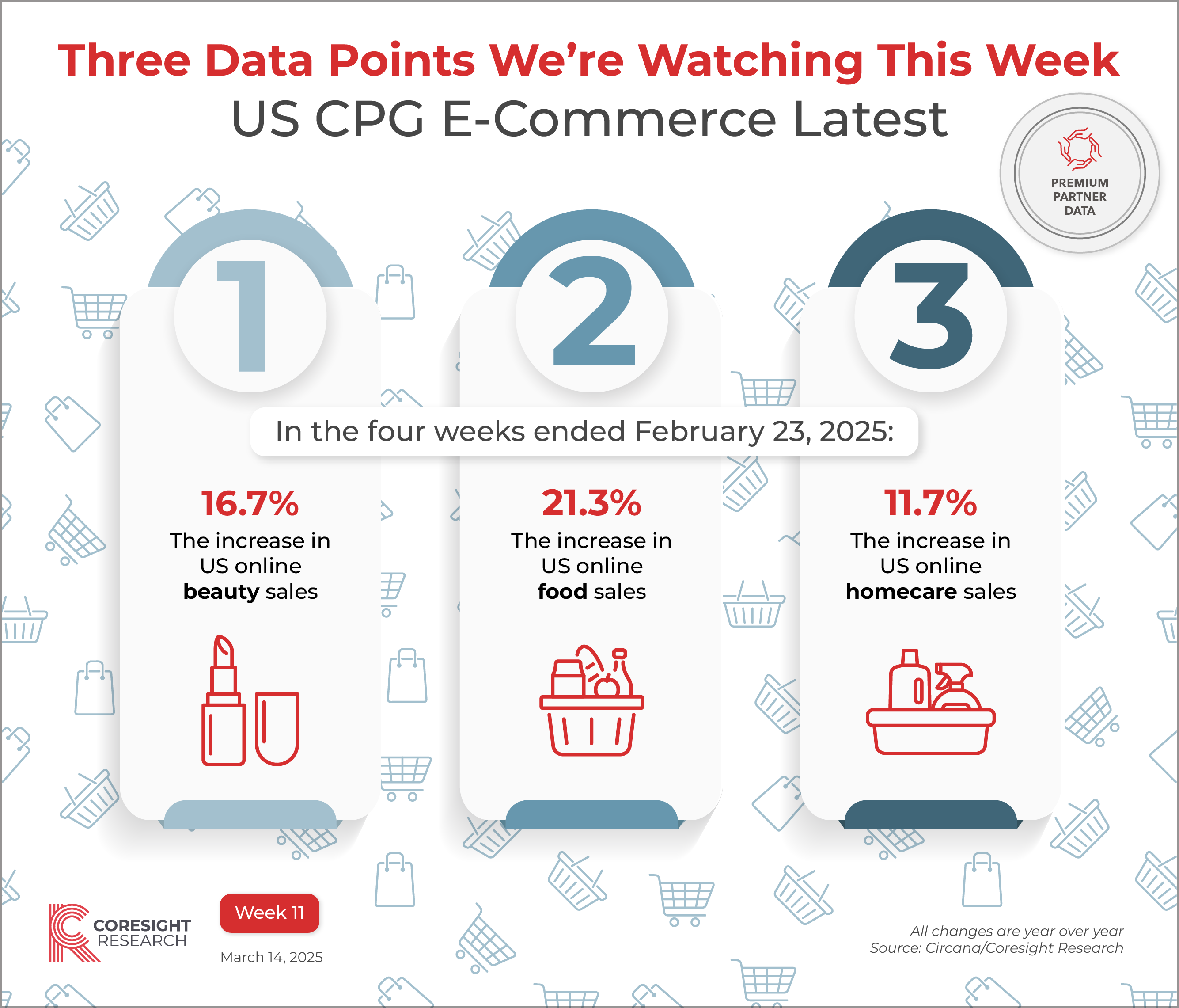 InfographicThree Data Points We’re Watching This Week, Week 11: US CPG E-Commerce Latest John Mercer, Head of Global Research and Managing Director of Data-Driven Research March 14, 2025 Reasons to ReadOur Three Data Points We’re Watching This Week series spotlights key data points from this week’s research. Discover key data points we are watching in week 11 of 2025. This week, we focus on recent CPG (consumer packaged goods) e-commerce sales performance in the US. This graphic draws on data from the latest report in the monthly US CPG Sales Tracker series, which we produce in partnership with Circana. Dive into the full research report behind these data points: US CPG Sales Tracker: E-Commerce Sales Surge, Outpacing In-Store Growth Other relevant research: Visit the Coresight Research Food, Grocery and CPG Retail Hub to explore sector data, reports and company profiles The Market Sizes Databank offers an overview of key retail market or sector sizes, including Coresight Research projections for future years. All graphics in the Three Data Points series This document was generated for Other research you may be interested in: Shoptalk Fall 2025 Day Three: From Constraints to Catalysts—Technology Driving the Next Era of RetailMixed Signals—Economic Optimism Continues But Consumers Feel the Strain on Personal Finances: China Consumer Survey InsightsThe Agentic AI Playbook: Insights Presented by Deborah Weinswig at NRF 2025: Retail’s Big Show APACEarnings Insights 4Q24, Week 1: Levi Strauss, P&G, Walgreens and Others Post Sales Growth, While Burberry and Kimberly-Clark Report Declines