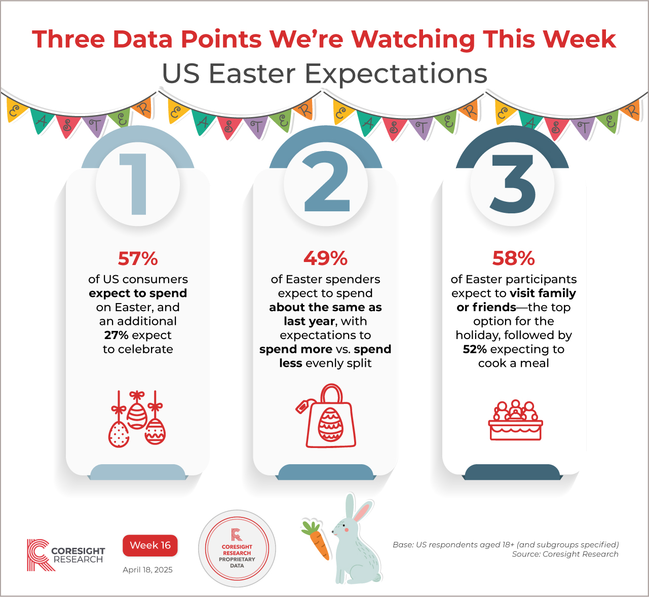 InfographicThree Data Points We’re Watching This Week, Week 16: US Easter Expectations John Mercer, Head of Global Research and Managing Director of Data-Driven Research April 18, 2025 Reasons to ReadOur Three Data Points We’re Watching This Week series spotlights key data points from this week’s research. Discover key data points we are watching in week 16 of 2025. This week, we present proprietary survey findings on US consumers’ expectations for Easter activities and spending. Dive into the full research report behind these data points: Seasonal Shopping, 2Q25—Expectations for Easter, Memorial Day, Mother’s Day, Father’s Day; Plus, Holiday 2025 Plans: US Consumer Survey Insights Extra Other relevant research: All our coverage of US holiday retail and festivals/holidays Read the full series of US Consumer Survey Insights and US Consumer Survey Insights Extra reports. The Coresight Research US Consumer Survey Databank provides additional insight into US consumer behaviors from our weekly surveys. All graphics in the Three Data Points series This document was generated for Other research you may be interested in: Rolling Metric Stabilizes: Weekly US Consumer Sentiment, Week 38, 2025—InfographicThree Data Points We’re Watching This Week, Week 23: US Retail Sectors in FocusConsumer Confidence Rebounds in October: China Consumer Survey InsightsWeekly US and UK Store Openings and Closures Tracker 2025, Week 8: US Store Closures Exceed 3,000, Up 420% Year Over Year