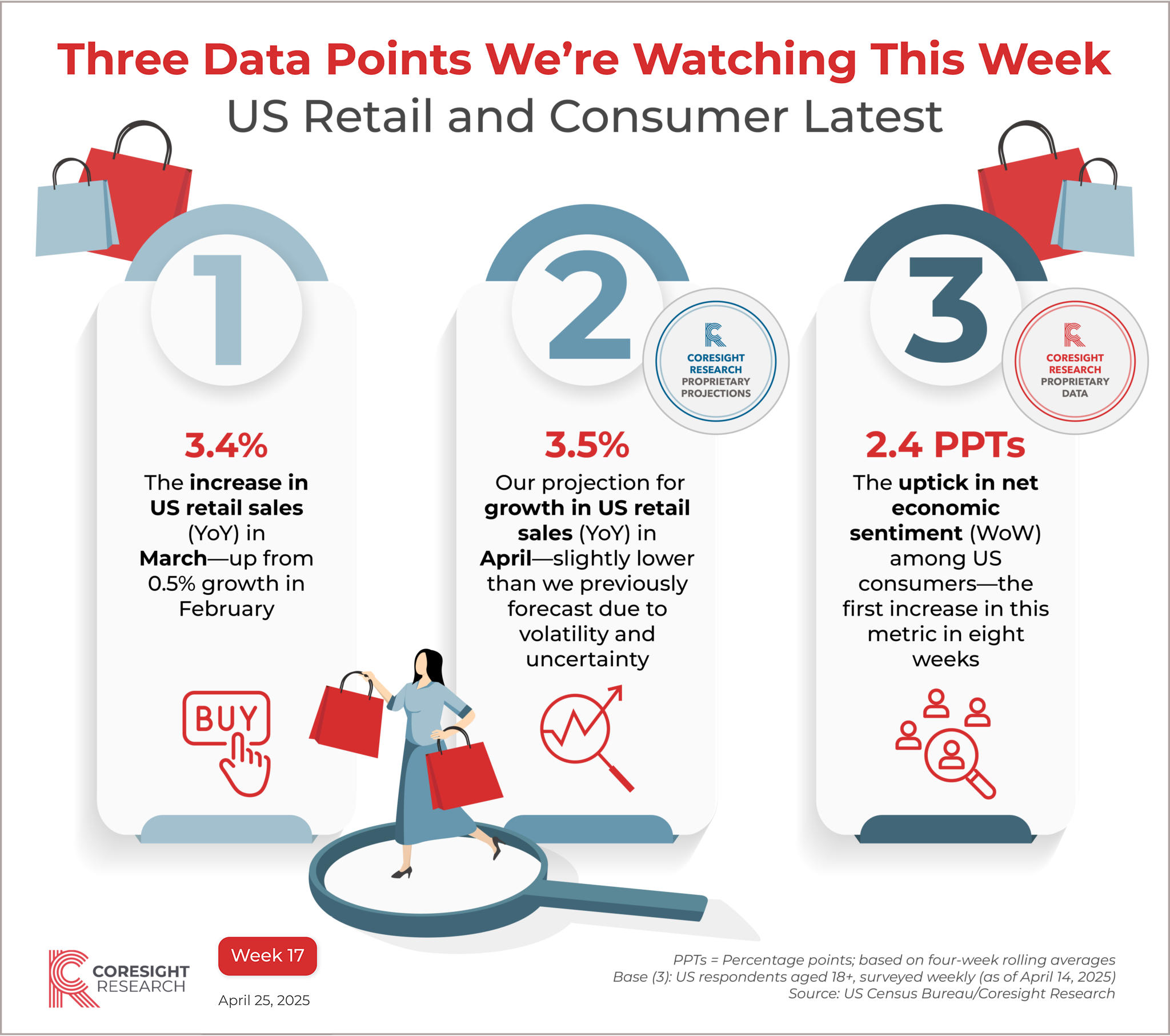 InfographicThree Data Points We’re Watching This Week, Week 17: US Retail and Consumer Latest Coresight Research April 25, 2025 Reasons to ReadOur Three Data Points We’re Watching This Week series spotlights key data points from our research. Discover key data points we are watching in week 17 of 2025. This week, we focus on US retail sales performance and projections as well as survey-driven insights on consumers’ economic expectations. Dive into the full research reports behind these data points: March 2025 US Retail Sales: Retail Sales Rebound Amid Tariff Concerns April 2025 US Retail Sales Outlook: Lowering Near-Term Growth Projections Amid Volatility and Uncertainty Economic Sentiment Shows First Uptick in Eight Weeks; Plus, Drugstore and Pharmacy Shopping in Focus: US Consumer Survey Insights—with associated infographic Other relevant research: The US Retail Sales Databank features retail sales values and year-over-year growth, in total and by sector, by year and by month. This Databank is updated monthly. The Coresight Research US Consumer Survey Databank provides additional insight into US consumer behaviors from our weekly surveys. All graphics in the Three Data Points series This document was generated for Other research you may be interested in: Retail 2025: India Retail Predictions—Midyear Trends UpdateAnalyst Corner: Are You Ready for the Future of Physical Retail? Three Trends in US Retail Real Estate, with Anand KumarEarnings Insights 2Q25: Wrap-Up—Most Companies See Sales Improvement Despite Tariff ConcernsWeekly US and UK Store Openings and Closures Tracker 2025, Week 1: Big Lots Set to Keep Some Stores Open in 2025