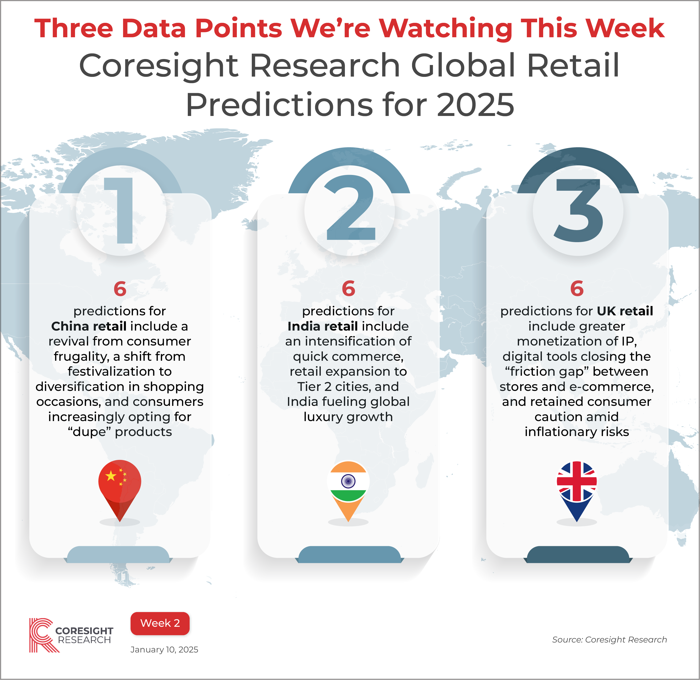 InfographicThree Data Points We’re Watching This Week, Week 2: Global Retail Predictions for 2025 John Mercer, Head of Global Research and Managing Director of Data-Driven Research January 10, 2025 Reasons to ReadOur Three Data Points We’re Watching This Week series spotlights key data points from this week’s research. Discover key data points we are watching in week 2 of 2025. This week, we focus on our 2025 outlooks for the China, India and US retail market. Our predictions touch on quick commerce, digital tools, consumer caution and more. Dive into the full research reports behind these data points: Retail 2025: China Retail Predictions Retail 2025: India Retail Predictions Retail 2025: What Will Redefine US Retail?—Coresight Research Predictions Other relevant research: Read more Coresight Research Retail 2025 reports All graphics in the Three Data Points series This document was generated for Other research you may be interested in: Three Data Points We’re Watching This Week, Week 18: What US Consumers Think About Tariffs—UpdateUS CPG Sales Tracker: In-Store Sales Recover; Beauty Leads Growth; Online Grocery Remains StrongRetail Technology Show 2025: Hearing About Sustainability, Smart Fashion, QR Codes, Unified Commerce and More4Q24 Earnings Season Wrap-Up: Which Companies Missed, Beat and Fell in Line with Expectations?—Infographic