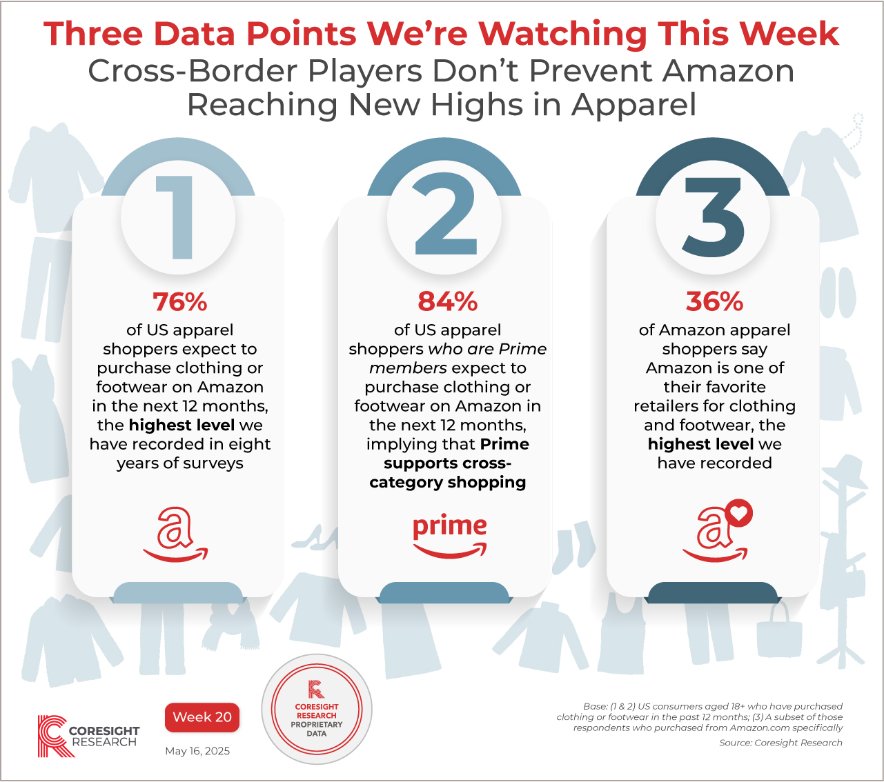 InfographicThree Data Points We’re Watching This Week, Week 20: Cross-Border Players Don’t Prevent Amazon Reaching New Highs in Apparel John Mercer, Head of Global Research and Managing Director of Data-Driven Research May 16, 2025 Reasons to ReadOur Three Data Points We’re Watching This Week series spotlights key data points from this week’s research. Discover key data points we are watching in week 20 of 2025. This week, we present proprietary survey findings on evolving consumer behaviors on Amazon.com across the US apparel and footwear category. Dive into the full research report behind these data points: Amazon Apparel US Consumer Survey 2025: New Shoppers, Deeper Loyalty—Amazon Converts Browsers into Buyers Other relevant research: Premium subscribers can download our more comprehensive infographic of selected findings from our Amazon Apparel US Consumer Survey 2025. Retailer Dashboard: Amazon Online Shopping in Focus—Amazon Dominates E-Commerce Competition: US Consumer Survey Insights Last year’s Amazon Apparel US Consumer Survey Visit the Coresight Research Fashion and Luxury Hub to explore sector data, reports and company profiles. The Amazon Databank brings together a range of proprietary Coresight Research data on Amazon, with a focus on its US retail and marketplace operations. All graphics in the Three Data Points series This document was generated for Other research you may be interested in: Weekly US Store Openings and Closures Tracker 2025, Week 39: Skims Continues To Expand Its FootprintFinancial Sentiment At Highest Level Year to Date: Weekly US Consumer Sentiment, Week 32, 2025—InfographicAnalyst Corner: US Shoppers Are Worried About Higher Prices from Tariffs—Consumer Survey Insights with John MercerInsights from China’s National Day Golden Week 2025: Resilience and Evolution in Consumer Demand