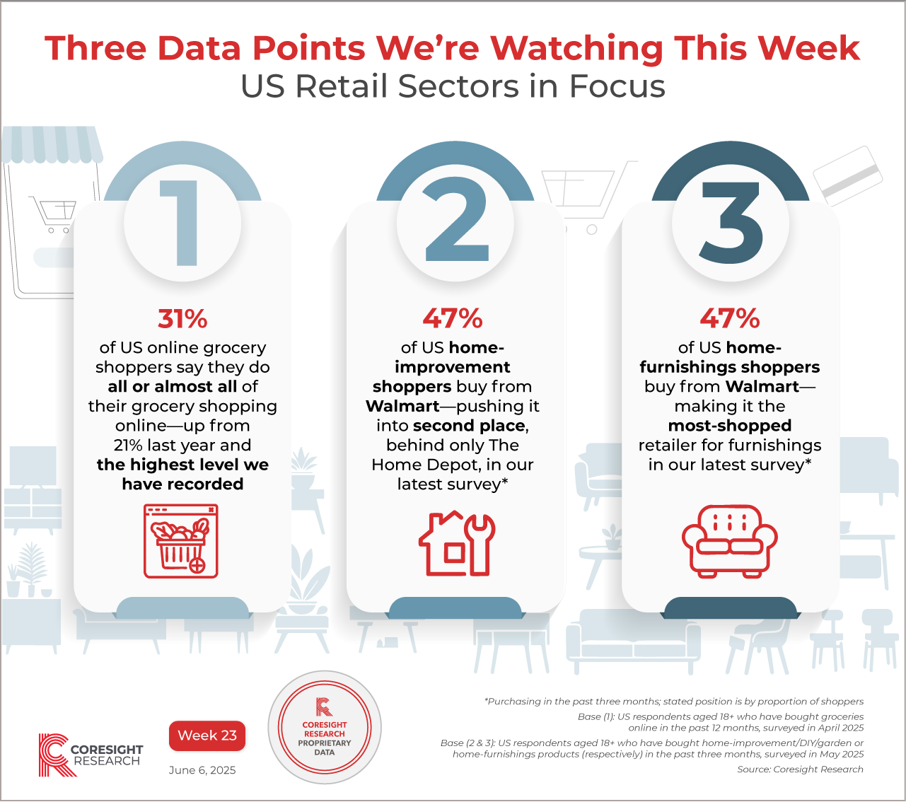 InfographicThree Data Points We’re Watching This Week, Week 23: US Retail Sectors in Focus John Mercer, Head of Global Research and Managing Director of Data-Driven Research June 6, 2025 Reasons to ReadOur Three Data Points We’re Watching This Week series spotlights key data points from our research. Discover key data points we are watching in week 23 of 2025. This week, we present proprietary survey findings on US consumers’ shopping behavior in the grocery, home and home-improvement sectors, uncovering the rise of e-commerce and Walmart. Dive into the research behind these data points: 1. US Online Grocery Survey 2025: Full-Basket Orders Increase as Delivery Retains Its Dominance 2 & 3. Economic Sentiment Climbs; Walmart Overtakes Lowe’s in Home-Improvement Sector: US Consumer Survey Insights Other relevant research: The Coresight Research US Consumer Survey Databank provides additional insight into US consumer behaviors from our weekly surveys. All graphics in the Three Data Points series This document was generated for Other research you may be interested in: Three Data Points We’re Watching This Week, Week 15: US CPG LatestThree Data Points We’re Watching This Week, Week 4: US Store Openings and Closures—2024 ReviewFive Ways Brands and Retailers Can Use AI/ML and Shared Data to Energize End-to-End Product ManagementThe State of AI: What’s Possible, What’s Theoretical and What It All Means for Retail