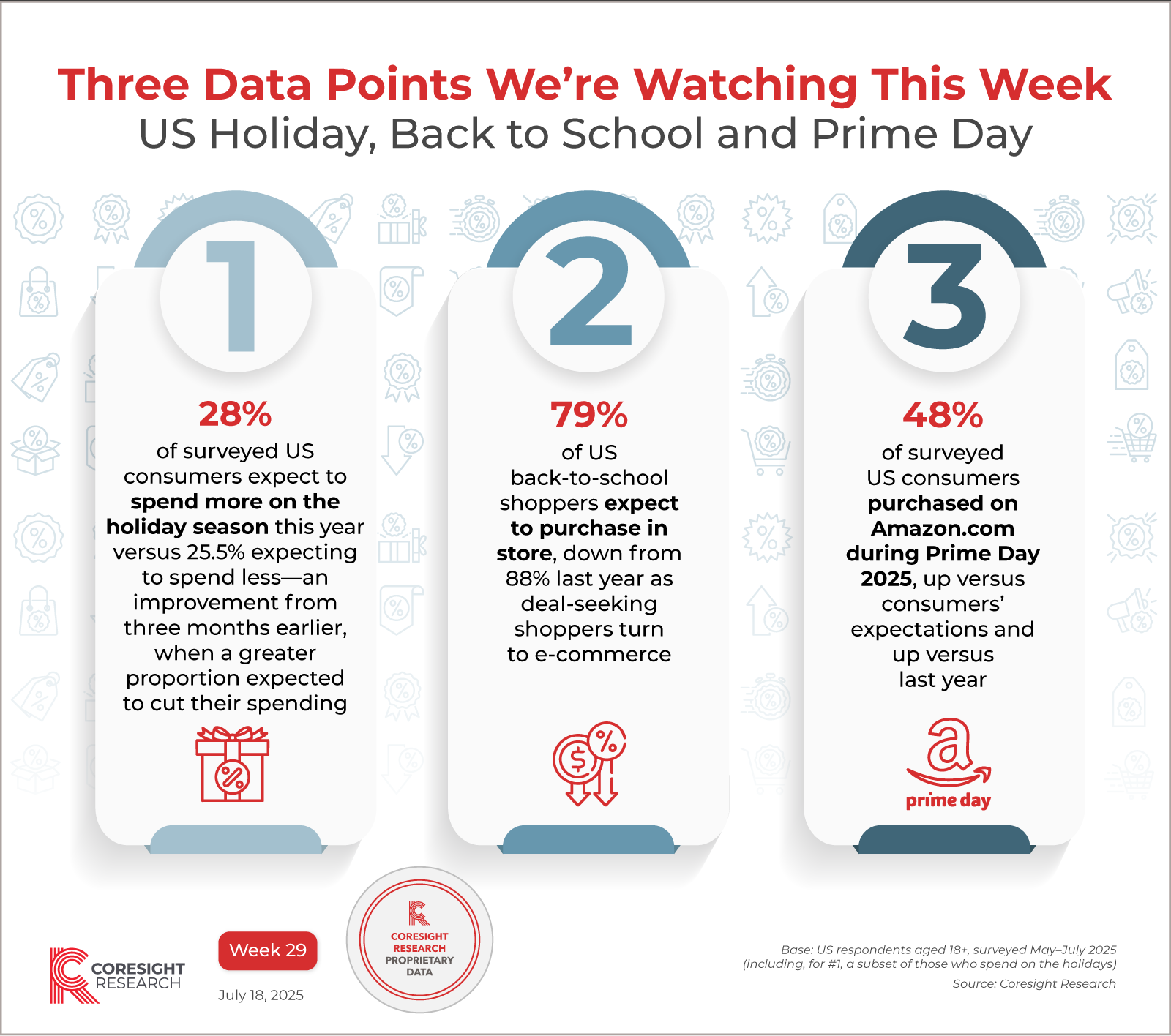 InfographicThree Data Points We’re Watching This Week, Week 29: US Holiday, Back to School and Prime Day John Mercer, Head of Global Research and Managing Director of Data-Driven Research July 18, 2025 Reasons to ReadOur Three Data Points We’re Watching This Week series spotlights key data points from our research. Discover key data points we are watching in week 29 of 2025. This week, we highlight consumer data on the holiday outlook, back-to-school shopping and Prime Day participation. Dive into the research behind these data points: US Holiday 2025: Early Outlook—Improving Signals, But Will It Last? US Back to School 2025: Where Consumers Will Shop—Opportunities with Higher-Income Shoppers, in Retail Media and on TikTok Amazon Prime Day 2025 Wrap-Up: US Purchase Rate Jumps as Retail Rivalry Heats Up—Exclusive Data Insights Other relevant research: More insights on Amazon’s Prime Day The Coresight Research US Consumer Survey Databank provides additional insight into US consumer behaviors from our weekly surveys. This document was generated for Other research you may be interested in: Three Data Points We’re Watching This Week, Week 2: Global Retail Predictions for 2025Personal Financial Sentiment Hits Six-Month Low: Weekly US Consumer Sentiment, Week 48, 2025—Data GraphicAnalyst Corner—US Convenience Store Retailing: Battling Headwinds and Seeking New Opportunities, with Sujeet NaikUnlock the Untapped Potential of AI-Powered MarTech: Coresight Research Premium Subscriber Call, April 2025