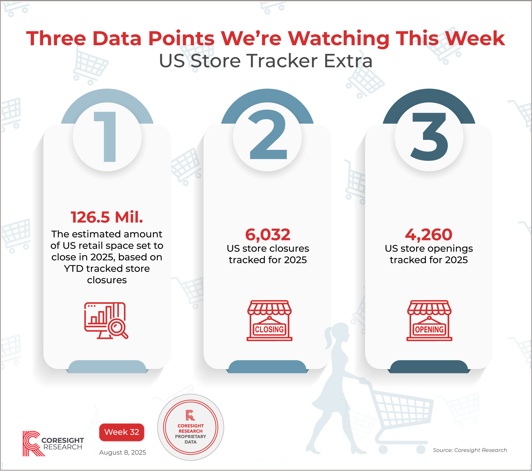 InfographicThree Data Points We’re Watching This Week, Week 32: US Store Tracker Extra John Mercer, Head of Global Research and Managing Director of Data-Driven Research August 8, 2025 Reasons to ReadOur Three Data Points We’re Watching This Week series spotlights key data points from our research. Discover selected data insights from Coresight Research. This week, we focus on US store data. Dive into the research behind these data points: US Store Tracker Extra, July 2025: 127 Million Square Feet of Retail Space To Close, Outpacing Openings by 60% Other relevant research: View our full collection of store tracker reports, covering the UK, the US and Canada. The US and UK Store Tracker Databank All graphics in the Three Data Points series This document was generated for Other research you may be interested in: Black Friday 2025: Key Insights from US Stores—Solid Shopper Demand, Some True Doorbusters and Greater Omnichannel IntegrationTariff Pessimism Cools; Inflationary Trade-Down Persists: US Consumer Survey Insights ExtraHigh-Income Consumers Turn Optimistic About Economy; Plus, Inflation Awareness Declines: US Consumer Survey InsightsHead-to-Head in US Department Stores: Kohl’s vs. Macy’s