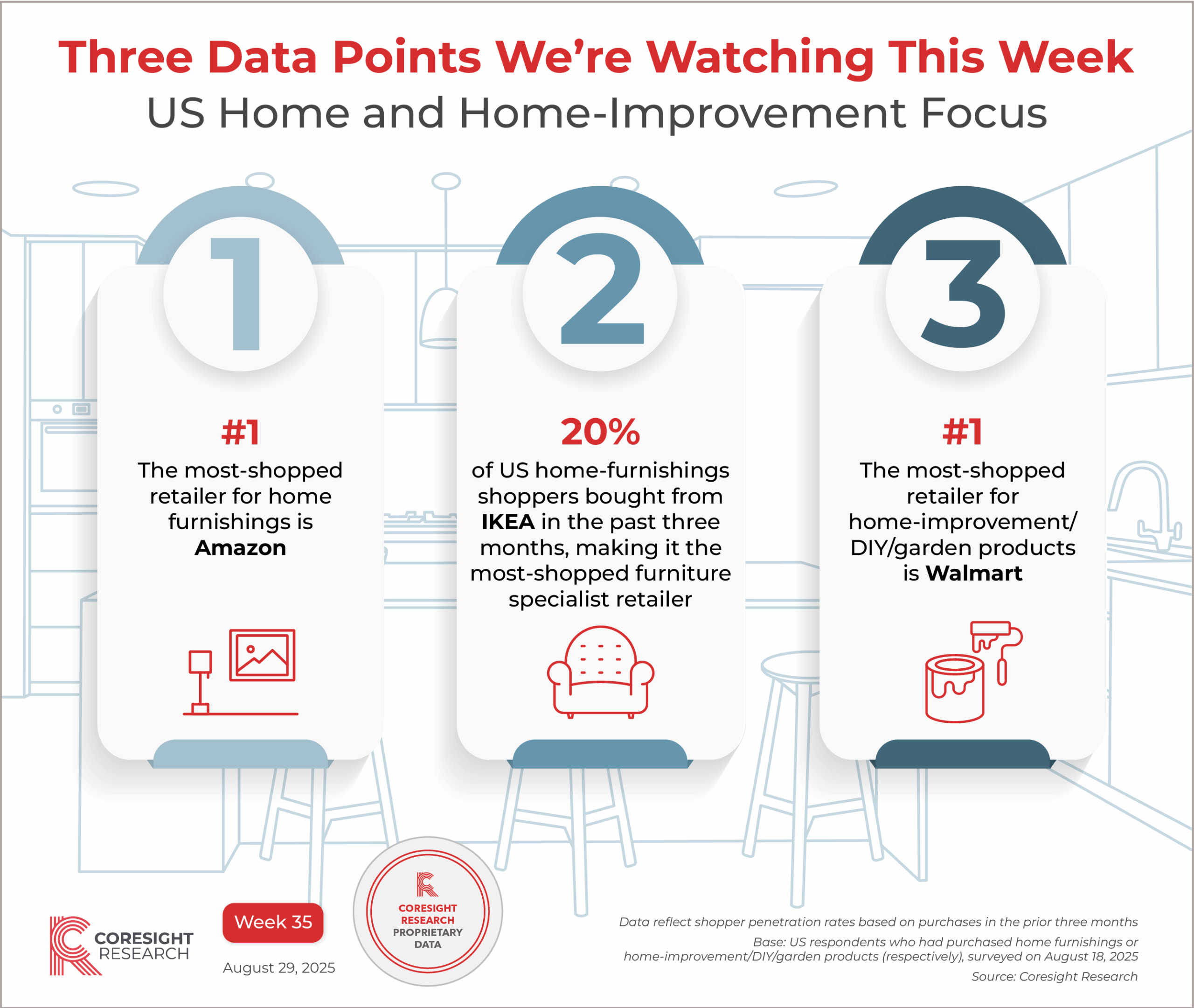 InfographicThree Data Points We’re Watching This Week, Week 35: US Home and Home-Improvement Focus John Mercer, Head of Global Research and Managing Director of Data-Driven Research August 29, 2025 Reasons to ReadOur Three Data Points We’re Watching This Week series spotlights key data points from our research. Discover selected data insights from Coresight Research. This week, US home and home-improvement in focus. Dive into the research behind these data points: High-Income Consumers’ Sentiment Soars Ahead; Plus, Home and Home-Improvement Shopping in Focus: US Consumer Survey Insights Other relevant research: The US Retail Sales Databank All graphics in the Three Data Points series This document was generated for Other research you may be interested in: Retail 2025: India Retail Predictions—Midyear Trends UpdateShoptalk Fall 2025 Wrap-Up: Driving Retail Forward—AI, Agility, Loyalty and Leadership in Volatile TimesMarch 2025 US Retail Sales: Retail Sales Rebound Amid Tariff ConcernsRetailTech: Empowering Retail’s Front Line, Creating Smarter Stores—Five Tech-Driven Strategies for Associate Enablement