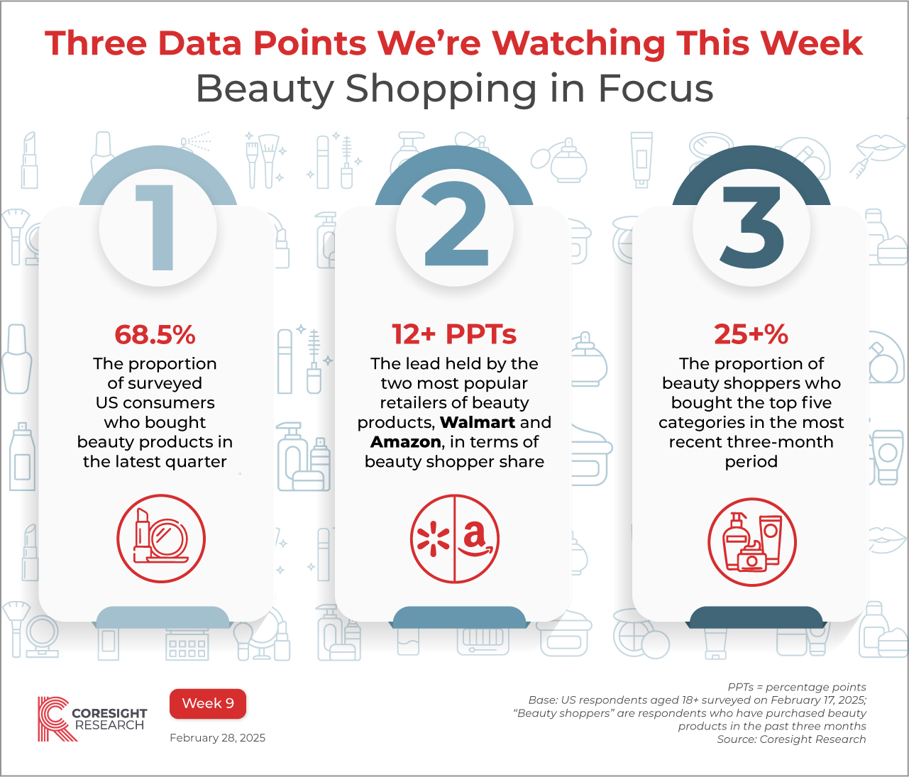 InfographicThree Data Points We’re Watching This Week, Week 9: Beauty Shopping in Focus John Mercer, Head of Global Research and Managing Director of Data-Driven Research February 28, 2025 Reasons to ReadOur Three Data Points We’re Watching This Week series spotlights key data points from this week’s research. For week 9 of 2025, we focus on beauty shopping, with highlights from our recent US consumer survey analysis. Dive into the full research report behind these data points: Beauty Shopping in Focus; Economic Sentiment Turns Negative: US Consumer Survey Insights Other relevant research: US Beauty—Retail 2025 Sector Outlook: Product Innovation and Unified Commerce To Drive Growth All our coverage of beauty retail The Coresight Research US Consumer Survey Databank provides additional insight into US consumer behaviors from our weekly surveys. All graphics in the Three Data Points series This document was generated for Other research you may be interested in: Shoptalk Spring 2025: Day Two—Next-Generation Search and the Leading Edge of Storytelling, from Influencers to Lived ValuesAgentic Commerce—How Should Retailers Leverage GEO to Maximize AI-Engine Visibility?Inside India’s Flourishing Men’s Skincare Market—Masstige Growth, Celebrity Influence and Tech InnovationWeekly US and UK Store Openings and Closures Tracker 2025, Week 2: Barnes & Noble CEO Announces Store Expansion Plan