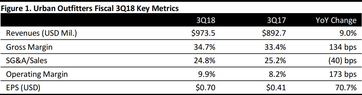 Insight Report 3 minutesFree ReportUrban Outfitters (URBN) 3Q18: Company Beats Expectations and Plans International Expansion Coresight Research November 20, 2018 Executive Summary Urban Outfitters reported fiscal 3Q18 revenues of $973.5 million, up 9.0% year over year and beating the $967.9 million consensus estimate. Adjusted EPS was $0.70, beating the $0.62 consensus estimate and up from $0.41 in the year-ago quarter. Comparable sales were up 8.0% year over year, even with the consensus estimate of 8.0%. The company did not provide quantitative guidance for FY19. In early 2019, Urban Outfitters plans to open its second European location. Additionally, the company plans to open a Free People’s first franchise location in Tel Aviv. Source: Company reports/Coresight Research 3Q18 Results Urban Outfitters reported 3Q19 revenues of $973.5 million, up 9.0% year over year and above the consensus estimate of $967.9 million. Adjusted EPS was $0.70 up 70.7% from the year-ago quarter, above the consensus estimate of $0.62 and above last year’s EPS of $0.41. By brand, Anthropologie Group net sales were $385.0 million, up 9.4% year over year. Urban Outfitters brand sales were $379.2 million, up 7.2% from the year-ago quarter. Free People sales increased 12.0%, to $202.2 million, and Food and Beverage sales increased 14.5% to $7.1 million. By division, retail net sales increased by 8.7%, to $878.9 million and wholesale segment sales were up 12.4%, to $94.7 million. The company reported that store comps have been positive for each of its brands for the third straight quarter, due to increased average unit selling prices and increased units per transaction. By brand, Free People comps were up 12.0%, below the 13.4% consensus estimate. Anthropologie Group comps were up 8.0%, beating the 6.4% consensus estimate, and Urban Outfitters brand comps were up 7.0%, below the 7.8% consensus estimate. The company reported that in retail, both digital and store channels comps delivered positive results. Digital led the way, posting double digit sales increases at each of the brands, driven by increases in sessions, average order value (AOV) and conversion rate. During the nine months ending October 31, 2018, the company opened a total of 14 new locations—three Free People stores, four Anthropologies Group stores, four Urban Outfitters stores, and three Food and Beverage restaurants; the company closed four locations: one Urban Outfitters store, one Free People store and two Anthropologie Group stores. During the nine-month period, three franchise-owned Urban outfitter stores were opened. The company reported that its international business is a strategic focus for the brand. In November 2018 it opened its first retail location in Amsterdam. Outlook The company did not provide quantitative guidance for FY19. In early 2019, Urban Outfitters plans to open its second European location. Additionally, the company plans to open Free People’s first franchise location in Tel Aviv. This document was generated for Other research you may be interested in: Test post for search