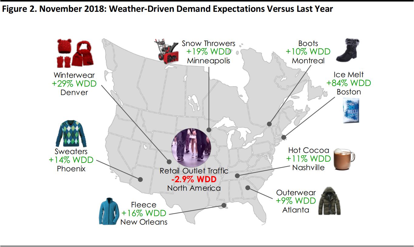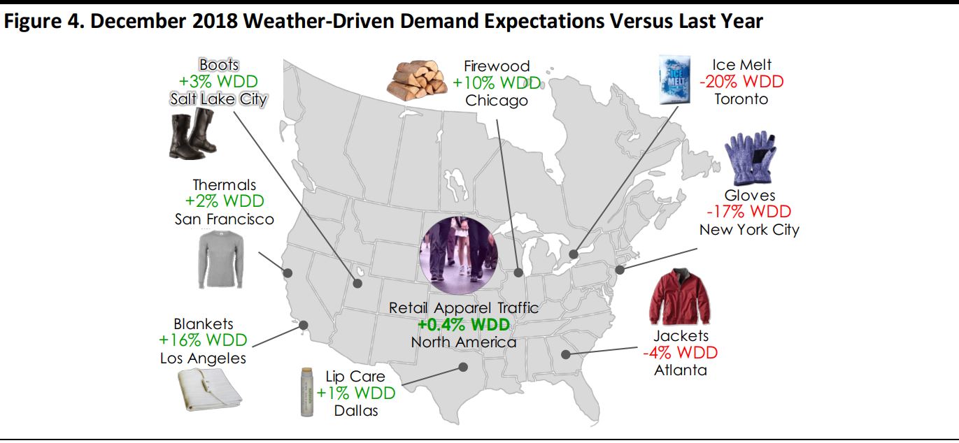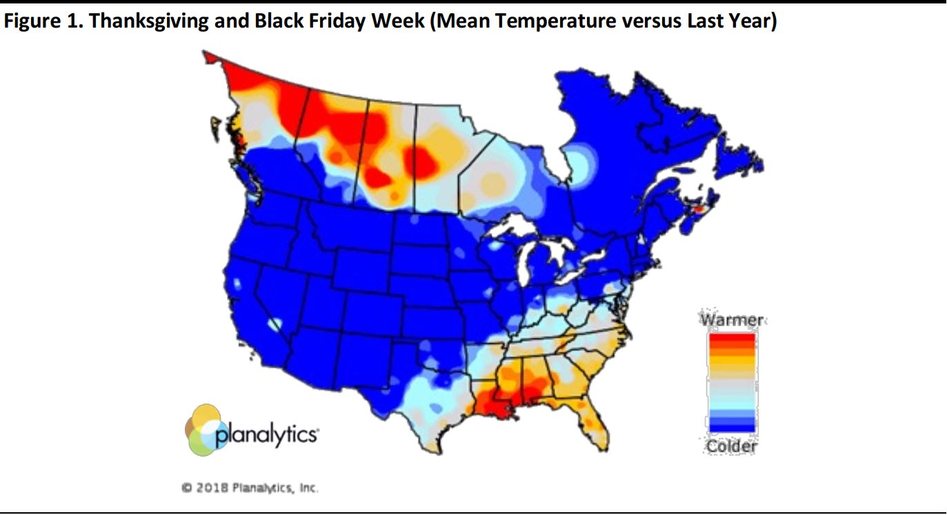 Insight Report 3 minutesFree ReportWeather Forecasters Expect a Chilly Black Friday Coresight Research November 21, 2018 Executive Summary The Thanksgiving and Black Friday holiday week is forecast to be colder than last year, with the US Northeast expected to experience at or near record cold, according to Planalytics. Snow is expected from Massachusetts to Albany, with wind chills falling below zero in the Northeast and into the teens from Philadelphia to Washington, DC. Temperatures across the US Gulf coast and the Canadian prairies are expected to be warmer than last year. The forecast calls for higher weather-driven demand for winterwear in Denver, fleece in New Orleans, sweaters in Phoenix and boots in Montreal. December weather is expected to be warmer and wetter than last year, which should drive relative demand for restaurants, home centers and specialty apparel and reduce demand for gloves, boots and hot cocoa throughout most of the continental US. Black Friday Forecast: Much Colder than Last Year The Thanksgiving-Black Friday holiday week is expected to be colder than last year, with extreme cold hitting on Thursday, November 22 and Friday, November 23. Snow is expected from Massachusetts to Albany, with wind chills falling below zero in the Northeast and into the teens from Philadelphia to Washington, DC. Temperatures across the US Gulf coast and the Canadian prairies are expected to be warmer than last year. The figure below shows a temperature forecast map (versus last year) for the Thanksgiving-Black Friday week in the US and Canada. Source: Planalytics The colder weather year over year should drive demand for apparel such as winterwear in Denver (29% higher), fleece in New Orleans (16% higher), sweaters in Phoenix (14% higher) and boots in Montreal, as well as other winter needs such as ice melt in Boston and snow throwers in Minneapolis (19% higher). Demand for cocoa is expected to be 11% higher in Nashville. Source: Planalytics December Forecast: Warmer and Wetter The December forecast is expected to be warmer than last year, particularly in Eastern Canada, but cooler in the US Southwest. The forecast also calls for more precipitation than last year across most of the US. Source: Planalytics Demand is expected to be higher for fleece in the Southwest but lower for boots, gloves and hot cocoa across the rest of the US. The impact of the warmer weather is expected to generate an incremental $1.1 billion in sales for restaurants, $727 for home-center stores and an additional $247 million for specialty apparel. Poor air quality caused by fires in northern California could dampen holiday spending in the San Francisco Bay Area. This forecast should generate weather-driven demand in December as illustrated below. Source: Planalytics The warmer weather is expected to drive lower demand for ice melt in Toronto, gloves in New York City and jackets in Atlanta. This document was generated for Other research you may be interested in: Test post for search