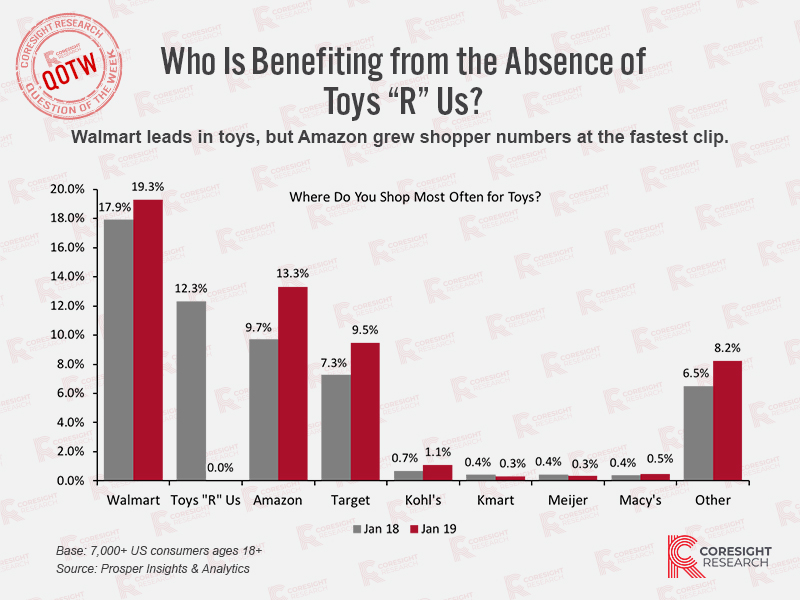 Question of the Week 1 minuteFree ReportWho Is Benefiting from the Absence of Toys “R” Us? Coresight Research February 18, 2019 QUESTION OF THE WEEK: Who Is Benefiting from the Absence of Toys “R” Us? Walmart leads in toys, but Amazon grew shopper numbers at the fastest clip. This document was generated for Other research you may be interested in: Test post for search