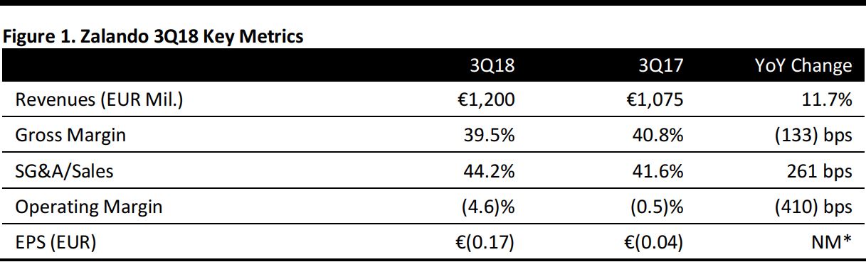 Insight Report 3 minutesFree ReportZalando (XTRA:ZAL) 3Q18 Results: Misses on Both the Top and Bottom Lines; Guidance Lowered Coresight Research November 7, 2018 Executive Summary In 3Q18, Zalando grew revenues by 11.7% year over year but missed the consensus estimates for revenues and EPS. A decline in gross margins and higher SG&A costs, mainly driven by a rise in fulfillment costs, led to a contraction in the operating margin. Management revised its FY18 guidance and now expects full-year revenue growth to be at the lower end of the previously stated 20%–25% target range. *Not meaningful Source: Company reports/Coresight Research 3Q18 Results Zalando grew revenues by 11.7% year over year to €1.20 billion in 3Q18, slightly below the consensus estimate of €1.22 billion and a sequential slowing from the 20.9% growth in 2Q18. Growth in revenues were driven by a 16.6% increase in gross merchandise volume (GMV) and a 22.8% increase in the number of orders. A long, hot summer resulted in a late switch to fall and winter shopping and weighed on sales growth. The company reported an increase in the number of active customers to 25.1 million. Zalando reported an operating loss of €55.7 million in the quarter, compared to an operating loss of €5.9 million in the year ago period. After adjusting for equity-settled share-based payments, restructuring costs and one-offs, EBIT came in at €(38.9) million, compared to €0.4 million in the year-ago quarter. Zalando attributed the increased expenses to the grant of further tranches under its share-based payments. The EBIT margin was also hurt by increased SG&A costs, including rising fulfillment costs. Fulfillment costs added 3.1 percentage points to EBIT margin decline and included costs related to logistics and technology, as the company plans to expand its logistics network. Logistics costs were also impacted by a decrease in the average basket size and an increase in carrier prices. Zalando reported a 7.3% year over year decline in the average basket size to €57.5, mainly due to the seasonal mix as a higher proportion of orders was for lower-priced summer articles available at higher discounts than fall articles. Diluted EPS of €(0.17) fell short of the consensus estimate of €(0.13). Segment Performance Fashion Store: This segment, which comprises full-price websites, grew revenues by 10.8% year over year and reported EBIT of €(54.8) million. Off price: This segment grew revenues by 40.2% year over year and reported an EBIT of €7 million. All Others: This segment, which includes private labels and various emerging businesses, reported 23.0% year-over-year increase in revenues and posted an EBIT of €(6.5) million. Outlook Management lowered its FY18 guidance and now expects full-year revenue growth to be around the lower end of the previously stated 20%–25% target range (lowered from 2Q18 guidance of the “lower half” of this range). It expects adjusted EBIT in the €150–€190 million range, revised from the previously stated €220–€270 million range. The company plans to continue its investments in logistics and technology and anticipates spending €300 million in 2018, which is slightly lower than the previous estimate of €350 million. This document was generated for Other research you may be interested in: Test post for search